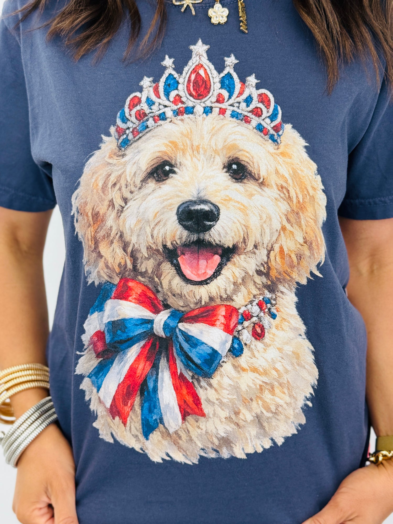 Celebrate patriotic style with this charming navy crewneck tee featuring an adorable dog graphic. The pup sports a red, white, and blue crown and matching bow, bringing playful Americana vibes to your everyday wardrobe. Soft, comfortable short sleeves make it perfect for casual wear year-round. Available in regular and plus sizes.