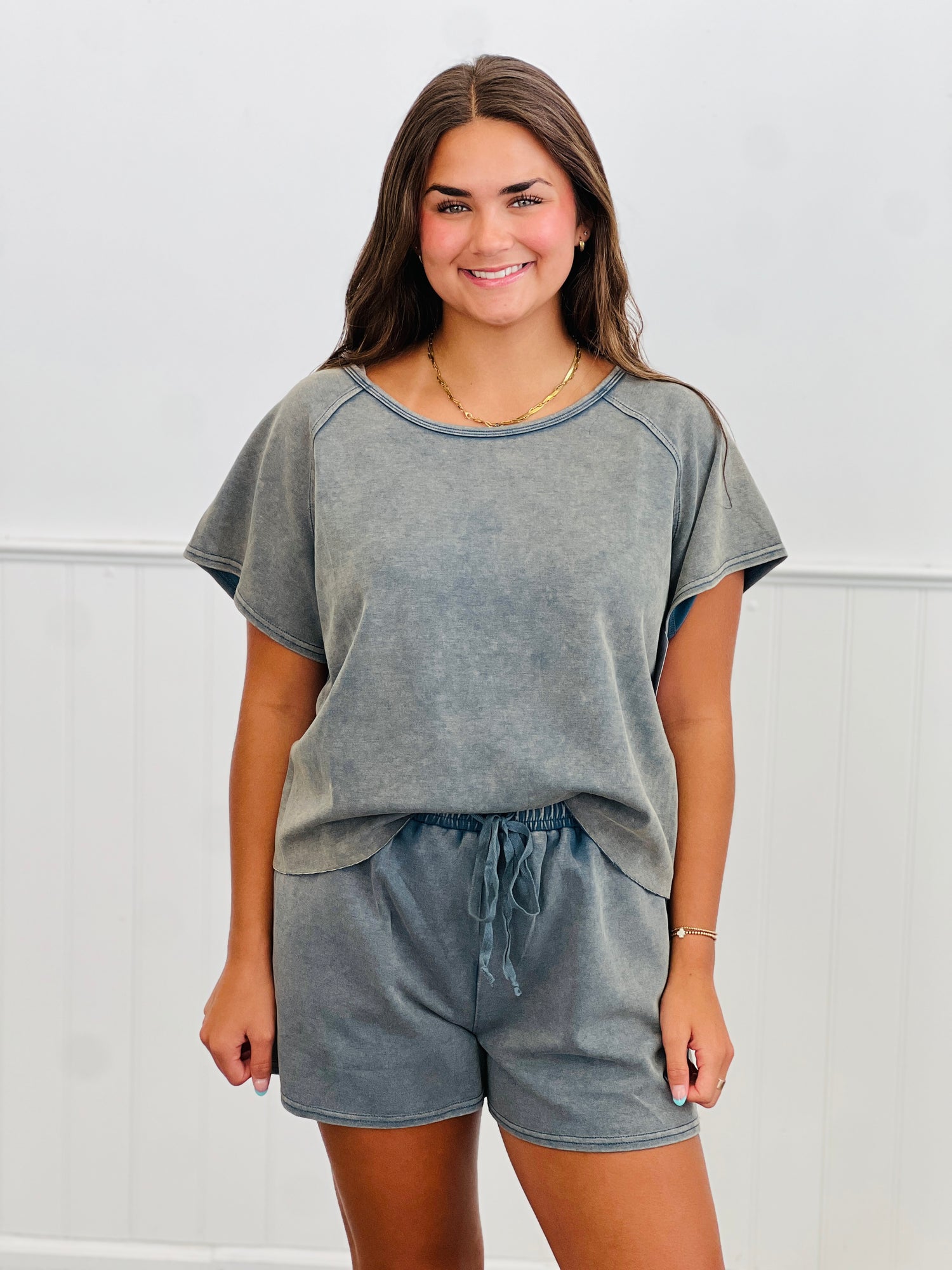 Get ready to look cute and stay comfy wearing this Ashed Denim Blue Top & Shorts Set! With its soft knit fabrication, short sleeves and round neck boxy top plus matching pull-on shorts featuring an elastic waist with a tie front and side pockets.