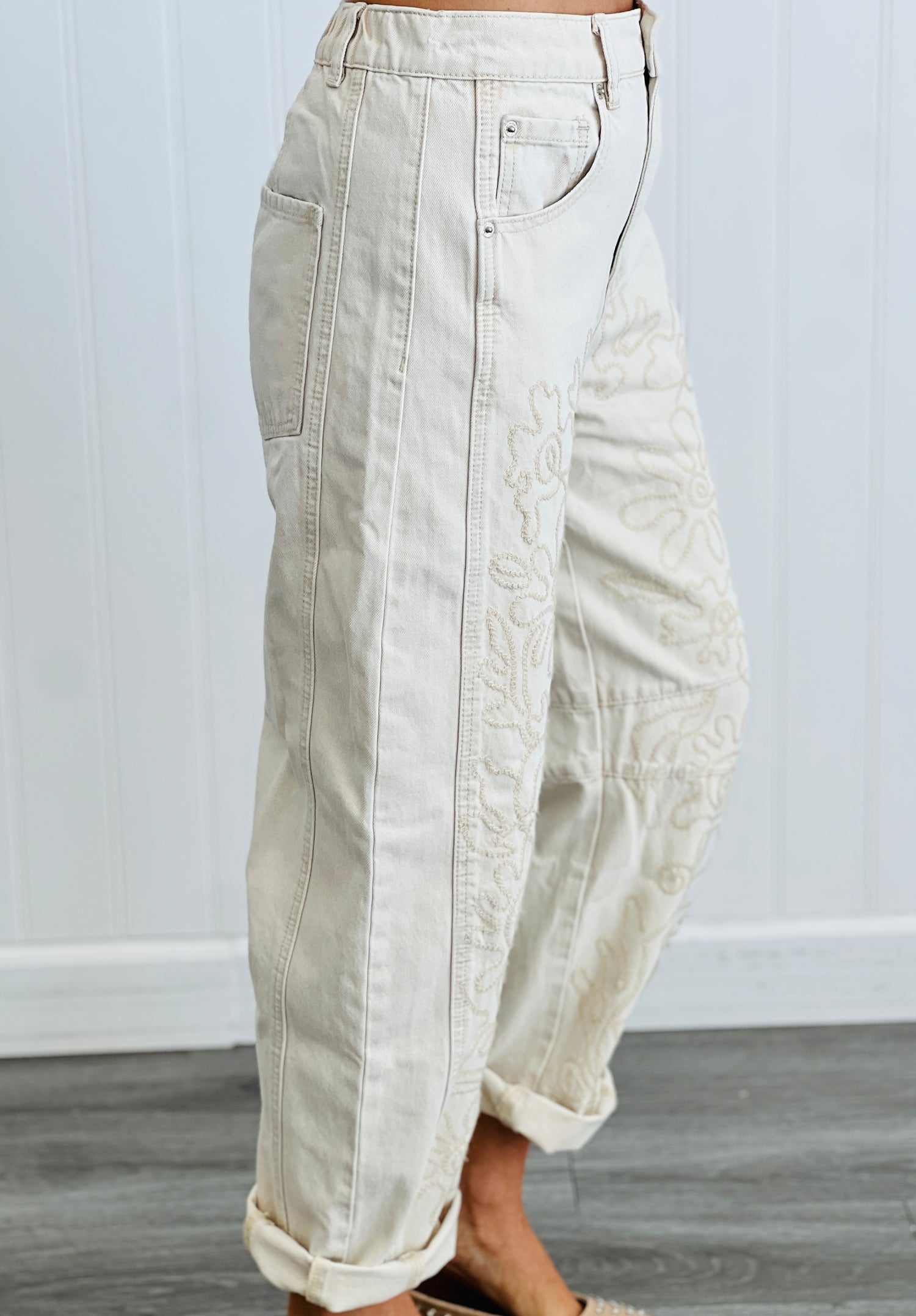 Step into easy elegance with these Beige Floral Embroidered Barrel Pants. Their soft neutral hue and delicate floral stitching bring a touch of whimsy to your wardrobe. The relaxed fit and gently curved legs keep things comfy and effortlessly cool—perfect for days when you want to look put-together without trying too hard. These pants are your new go-to for playful style with a subtle, textured twist.