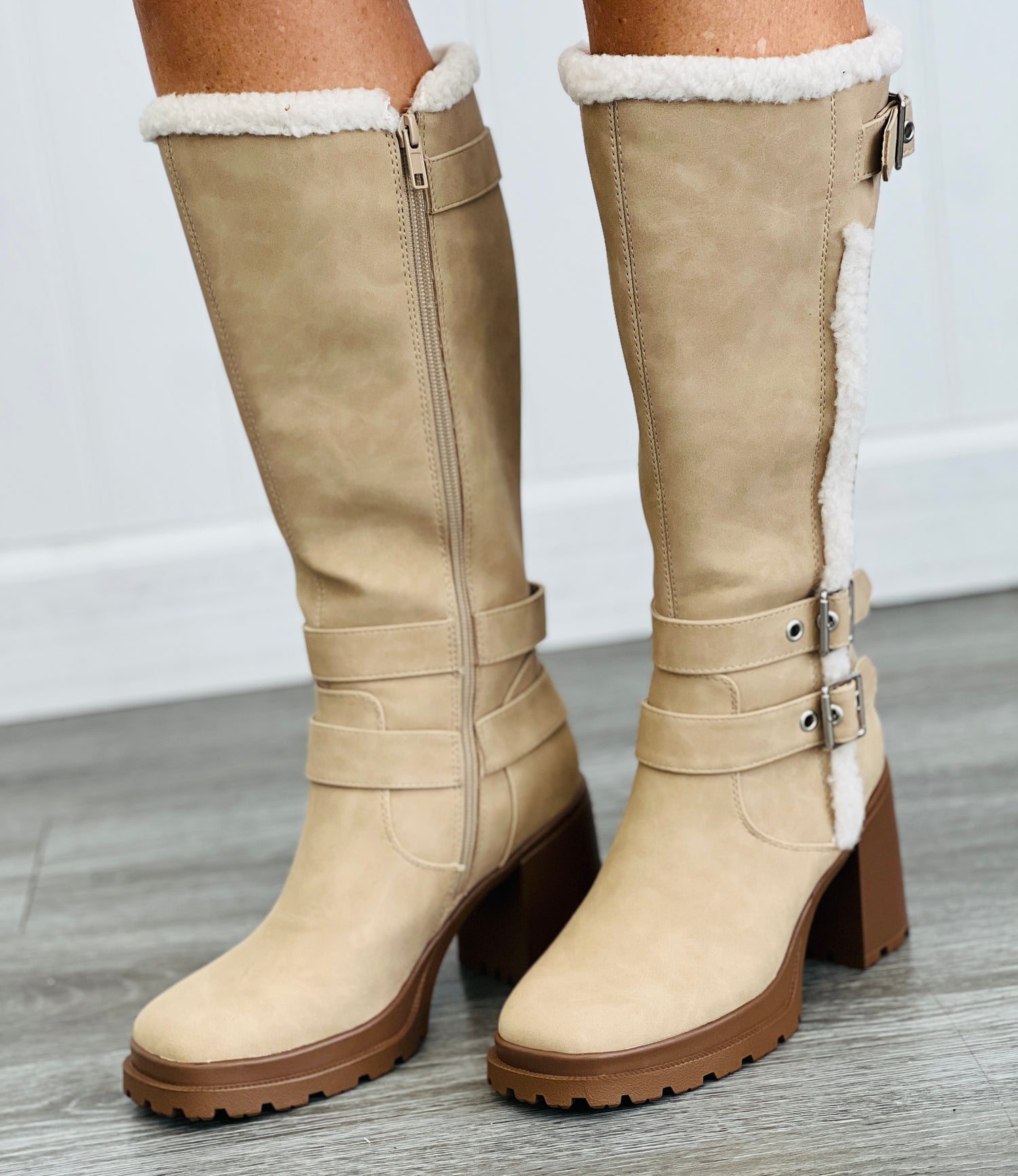 Step into style with these beige tall boots featuring faux fur detailing, buckle accents, and a side zipper for easy on and off. Complete with a sturdy block heel for comfortable all-day wear. Now that's what we call a "fur"-fect pair of boots!