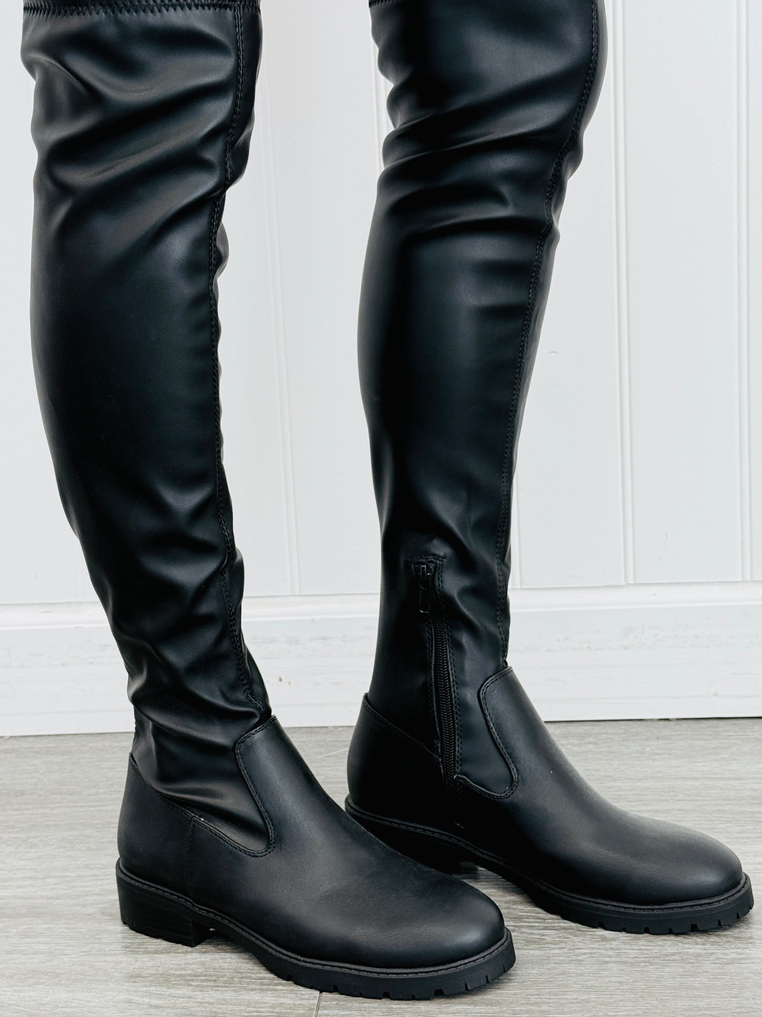 Take on the world in these Black Anywhere With You Boots. Made from faux leather, these knee high boots feature a stylish side zipper for easy wear. Perfect for any adventure, these boots will have you looking and feeling confident every step of the way.