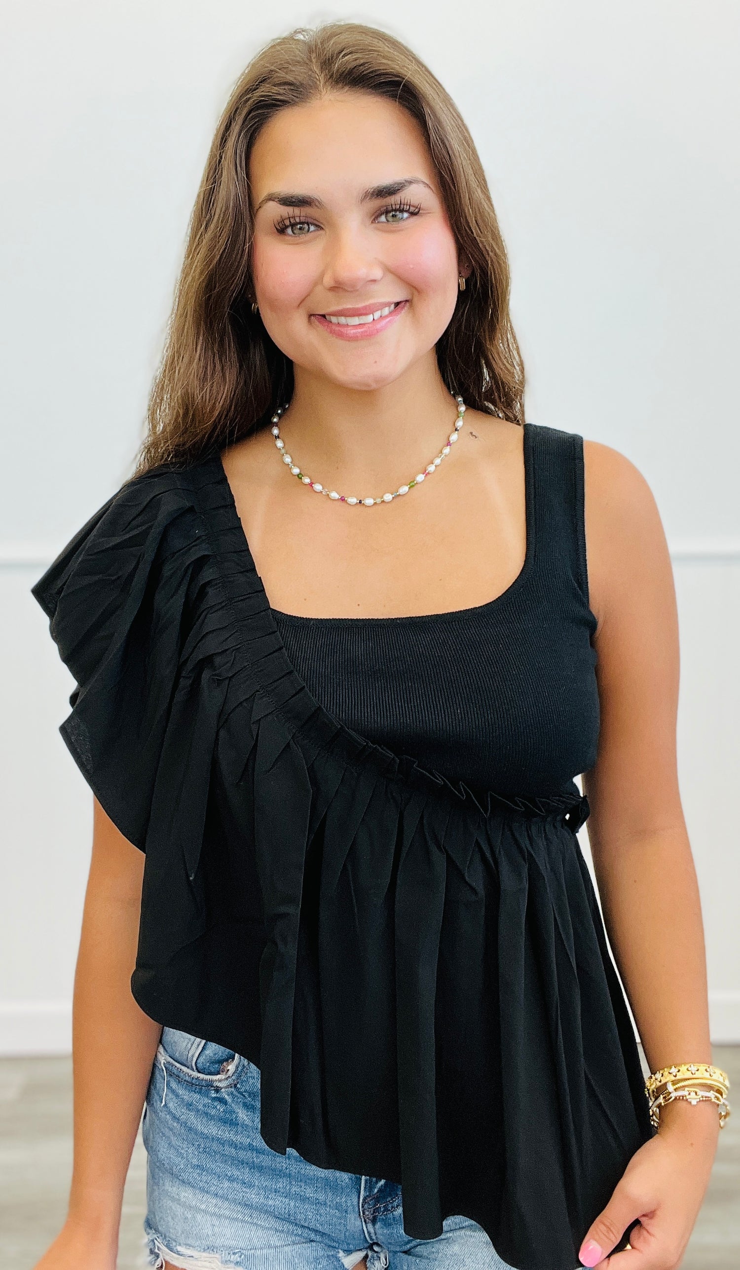 Add an element of uniqueness to your closet with this super cute Black Asymmetric Ruffle Top. Features include a square neckline, one sleeveless shoulder and one ruffle cap sleeve. The ruffle runs from the sleeve diagonally to the hemline.