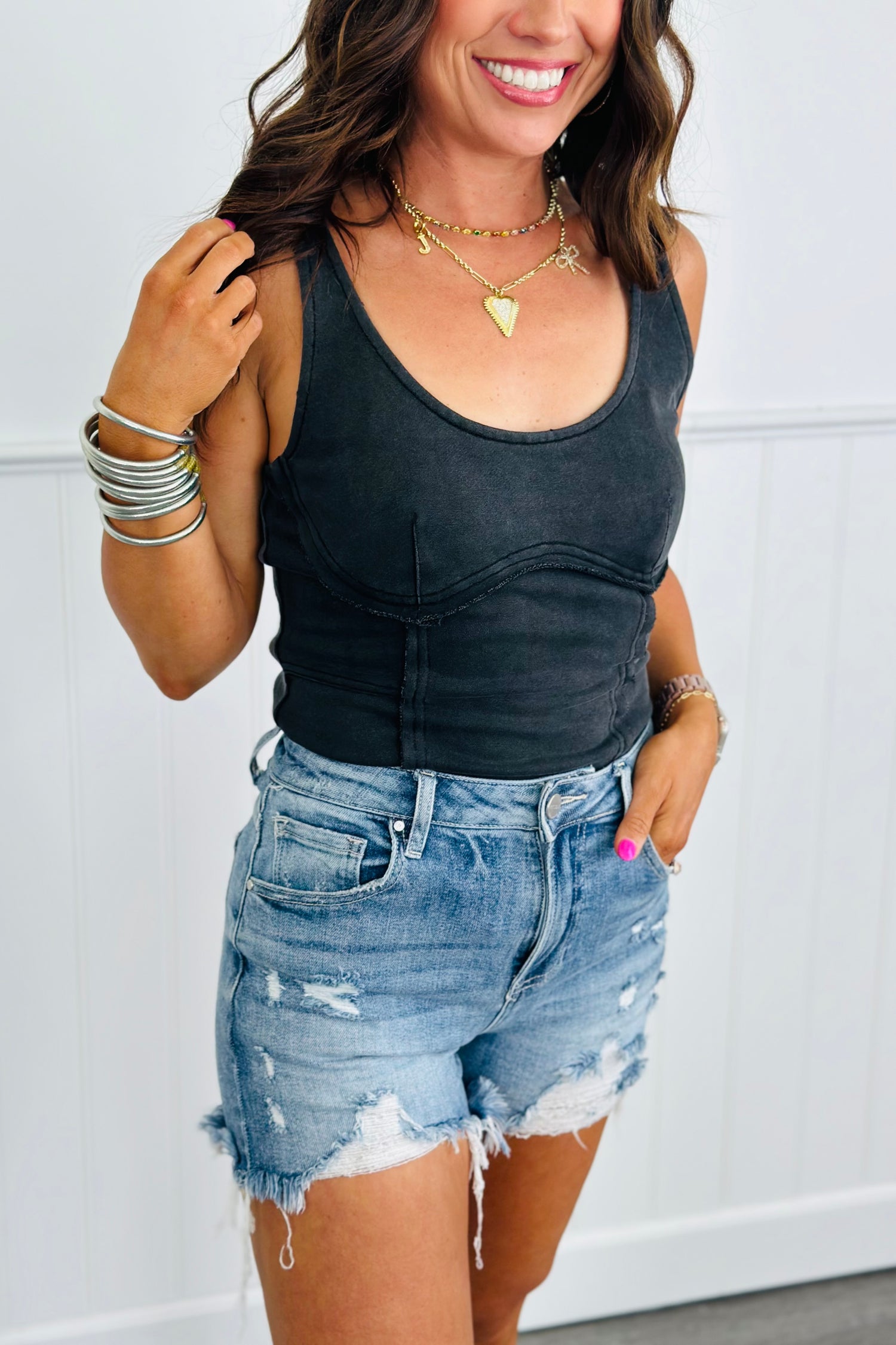 From the beach to the gym to the concert, this edgy bodysuit features a body-hugging fit that's a must for your effortlessly cool going-out looks. Cotton french terry essential vintage look with fading fabrication, bust curve and raw edges.