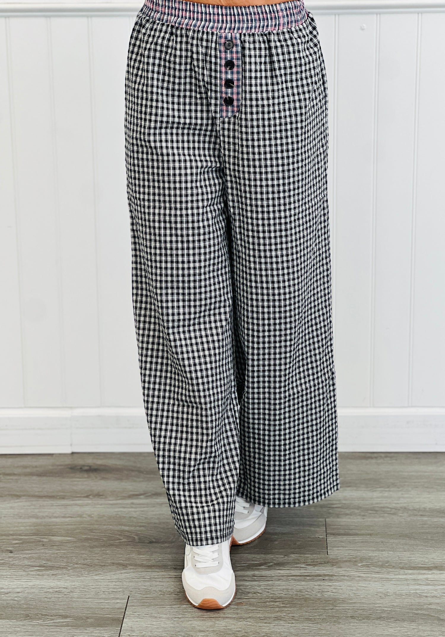 These Black Combo Relaxed Wide-leg Pants bring comfort and style together with their elastic smocked waistband and charming button placket. The allover plaid pattern adds a playful twist, making them perfect for lounging or casual outings. Slip into effortless cool with a relaxed fit that moves with you all day long.
