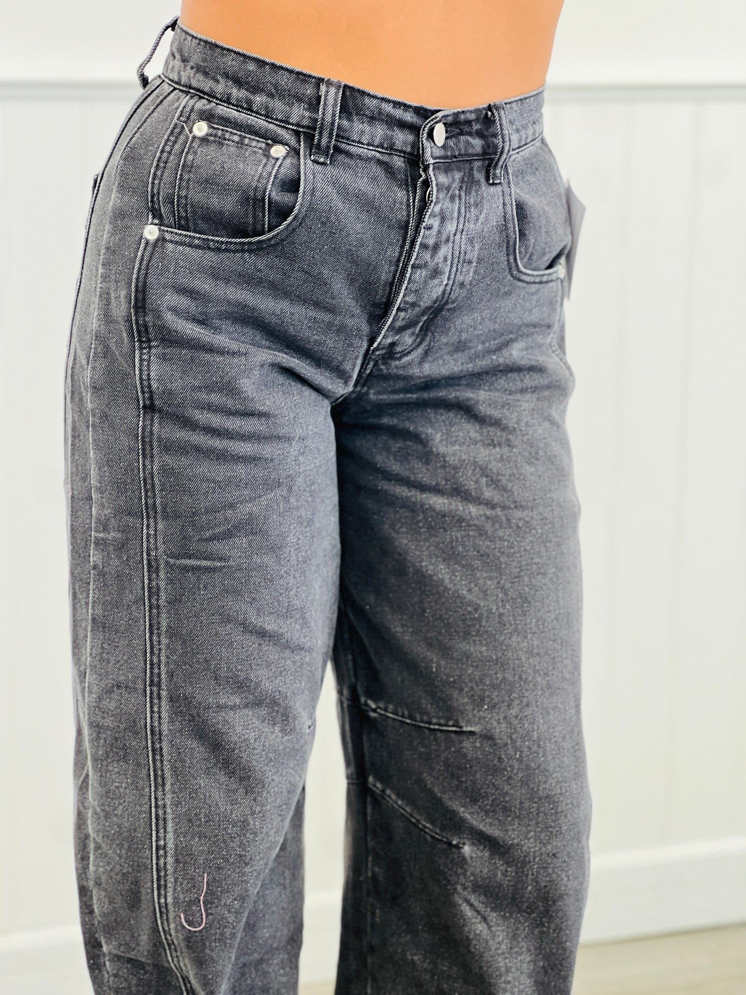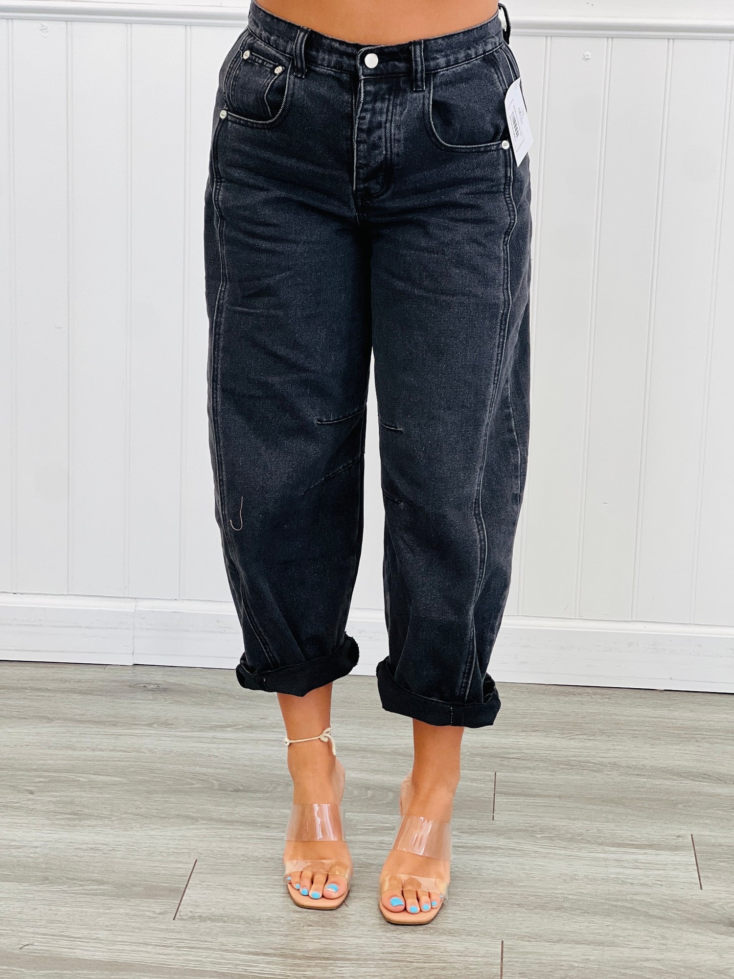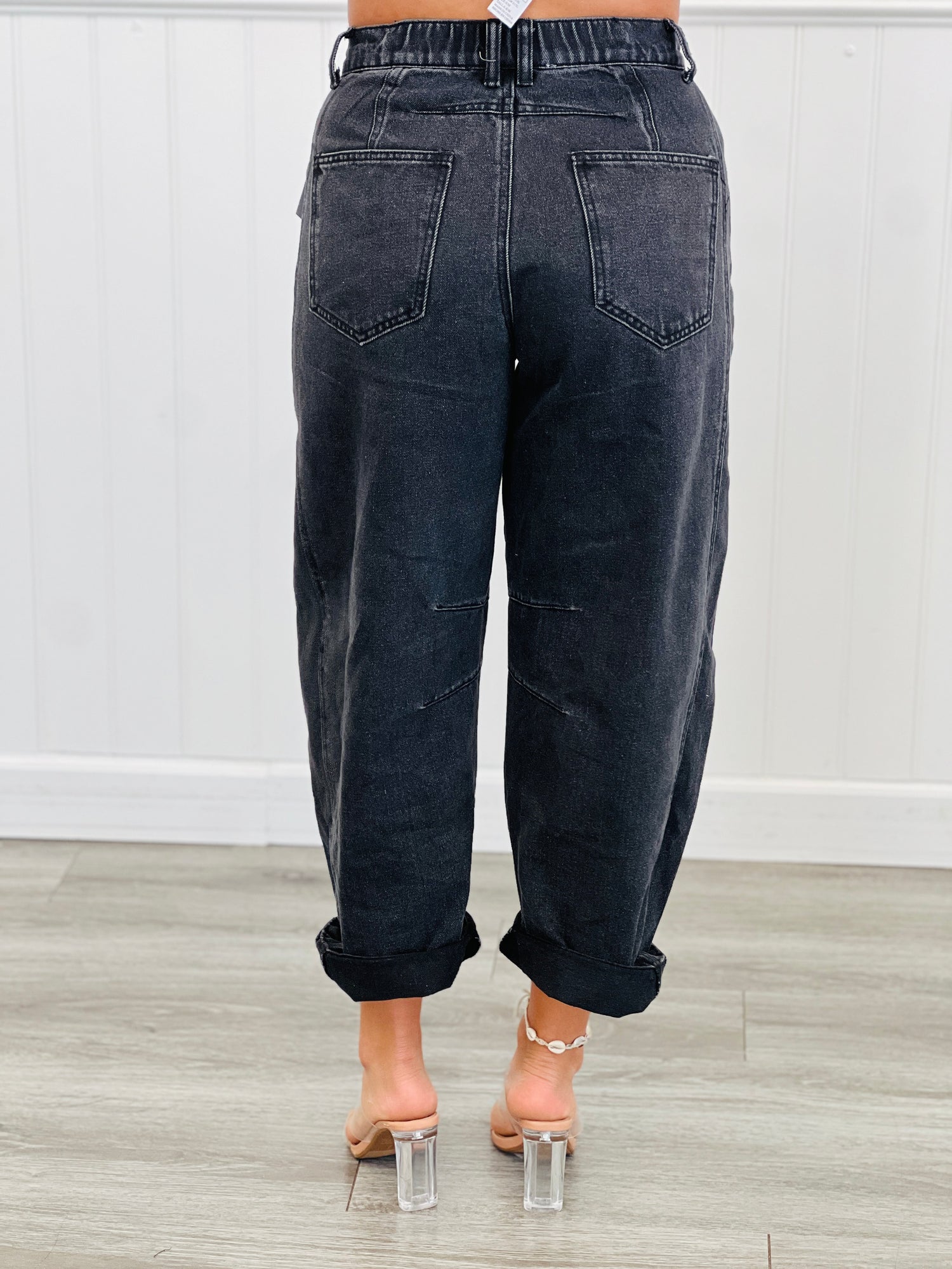Stay comfortable and stylish in our Black Denim Barrel Pants. Features include a front button & button fly closure and a slightly cropped silhouette. The wide legs and back elastic waistband ensures a perfect fit. Perfect for any occasion, these pants will become your new go-to for effortless fashion.