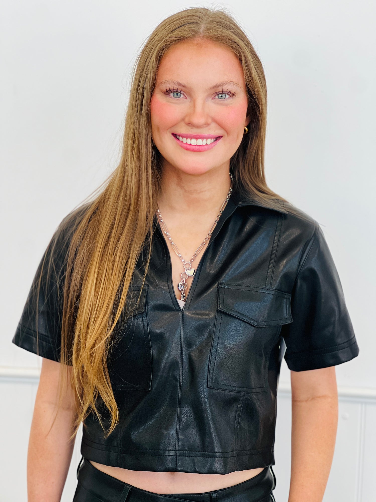 Bring some edge to your style wearing the Black Faux Leather Short Sleeve Top. This playful pullover top features a collared v-neckline, short sleeves, flap chest pockets and slightly cropped boxy silhouette. Perfect match to skort BOT4808.