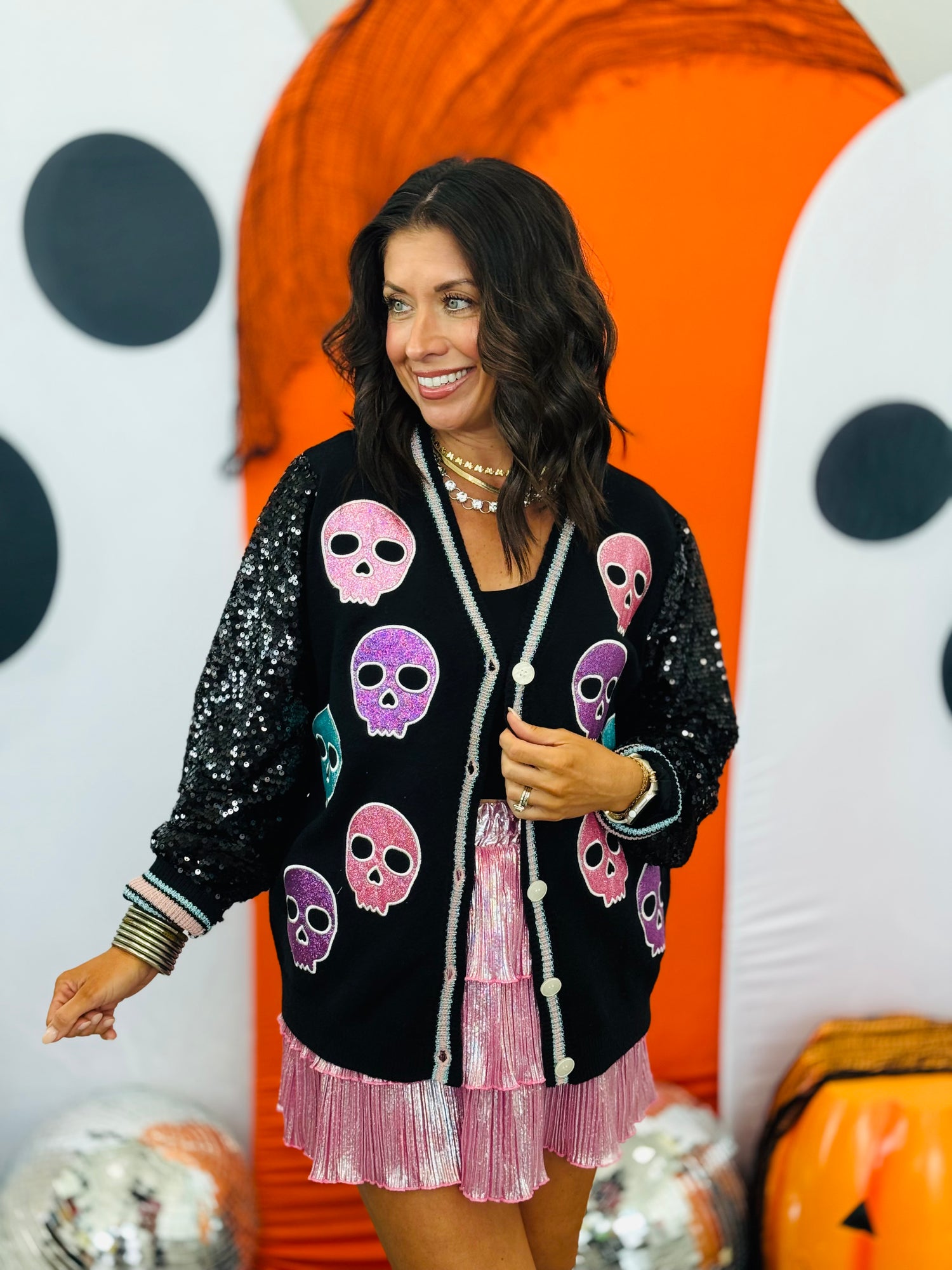 Add a touch of edgy sparkle to your wardrobe with this Black Glitter Skulls Button Up Cardigan. Featuring glitter skulls in a variety of colors and shimmering sequin sleeves, this playful cardigan buttons up for a fun, stylish look that stands out.