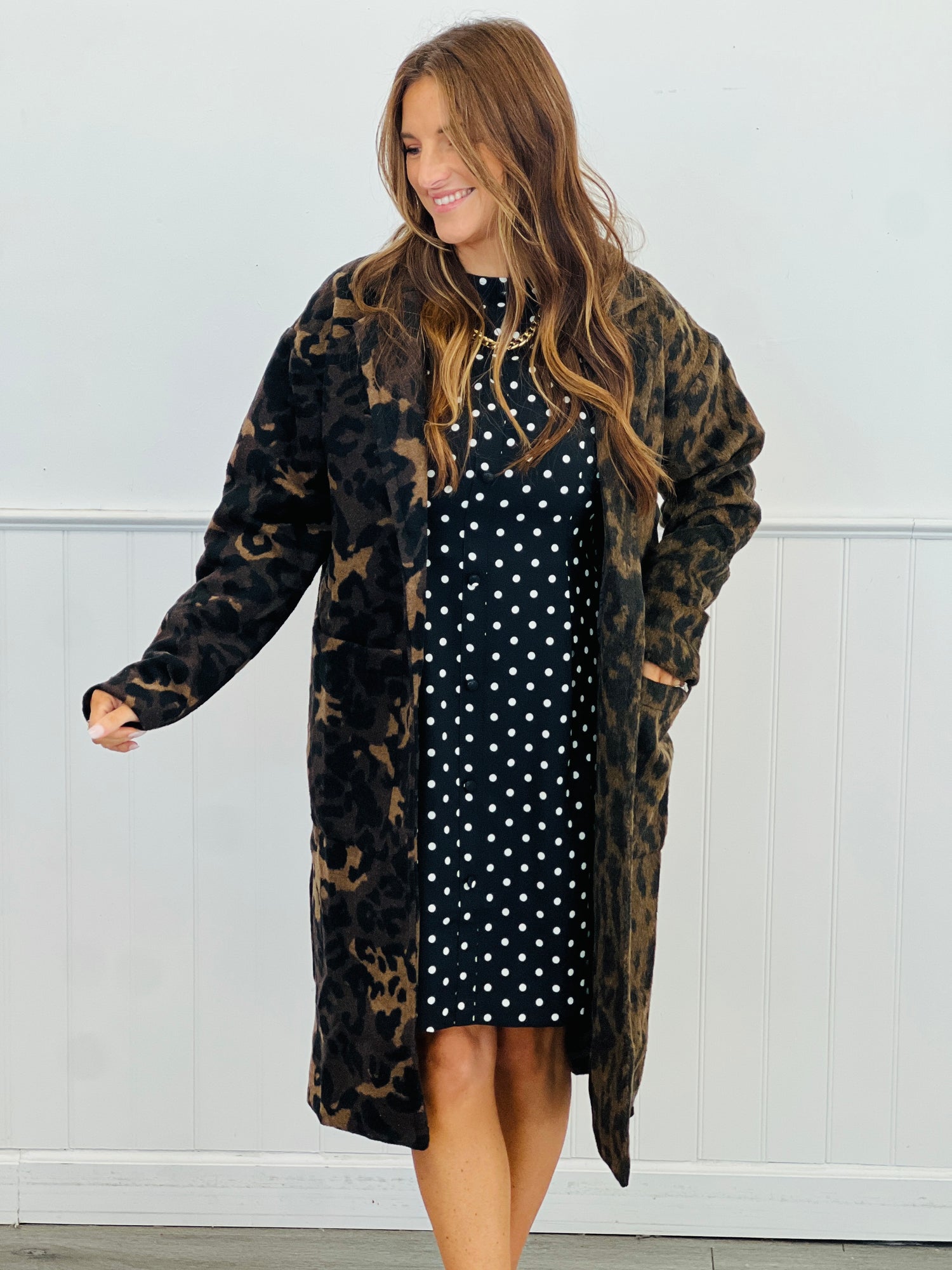 Introducing the classic Black/Ivory Sleeveless Polka Dot Mini Dress. It features a playful black & ivory polka dot print, a high rounded neckline, side pockets and a button-down front. Perfect for office wear, events, or a polished everyday look.