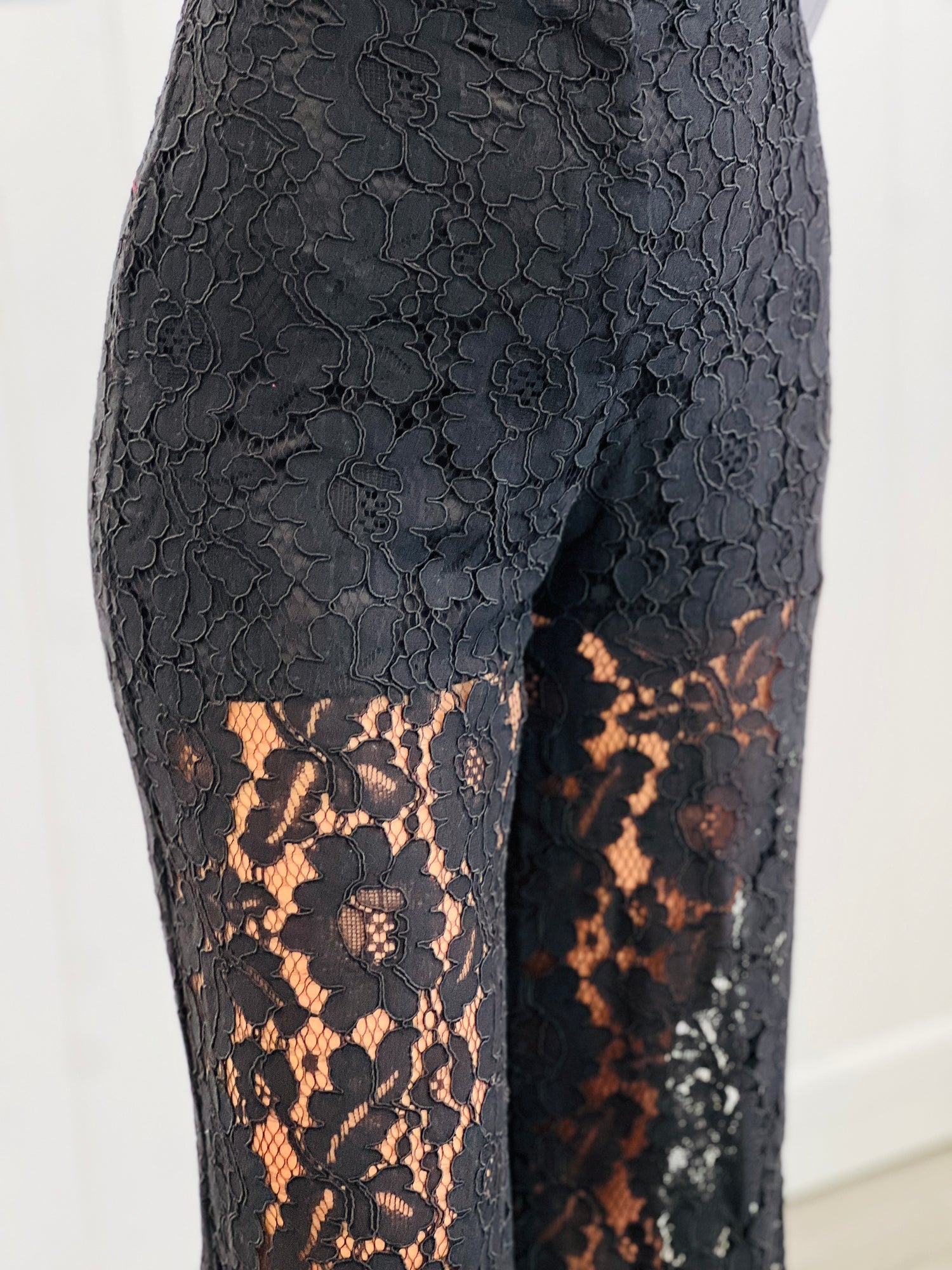 Add a flirty touch to your wardrobe with our Black Lace Trousers. Made from a combination of solid fabric on the shorts lining and semi-sheer lace, these unique pants are a fun choice. Button & zipper closure. Step out in style with this quirky and fun addition to your closet.