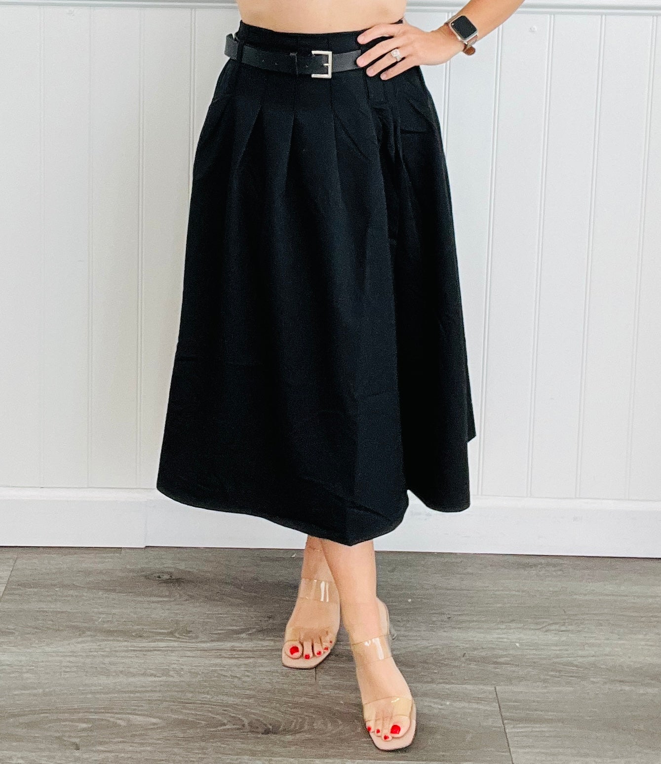 Get ready to turn heads with our black belted pleated midi skirt. This skirt not only features a stylish side zip, but also a flattering belted waist and elegant pleats. Perfect for adding some edge to your wardrobe.