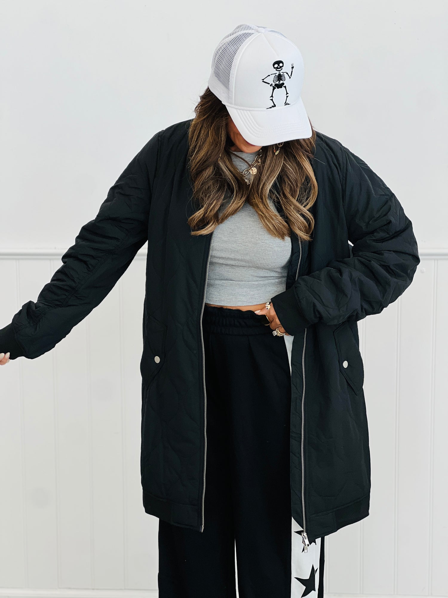 Stay cozy and stylish with this Black Quilted Long Bomber Jacket! Featuring a double-sided zipper for versatile looks and handy side pockets to stash your essentials, this thigh-length jacket is perfect for those cool days when you want to wrap up without sacrificing flair. Ready to zip into comfort and turn heads? This jacket’s got you covered!