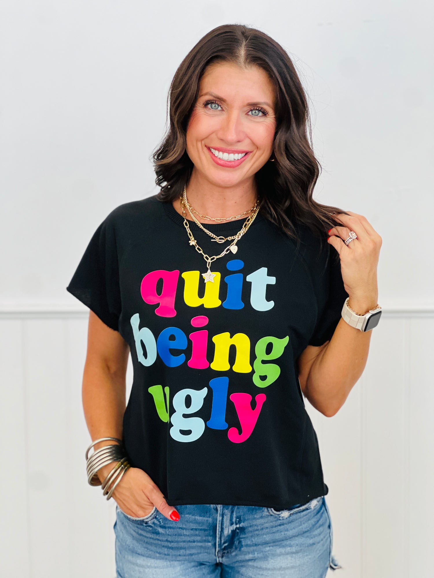 This black semi-cropped tee brings a fun twist to your wardrobe with its bold "Quit Being Ugly" graphic in multiple colors on the front. Featuring raglan-style un-seamed shoulders, paneled sides, and stylish un-hemmed edges, it offers a relaxed fit that’s both comfortable and eye-catching. Perfect for adding a playful edge to any casual outfit. Available in regular and plus sizes to suit your style.