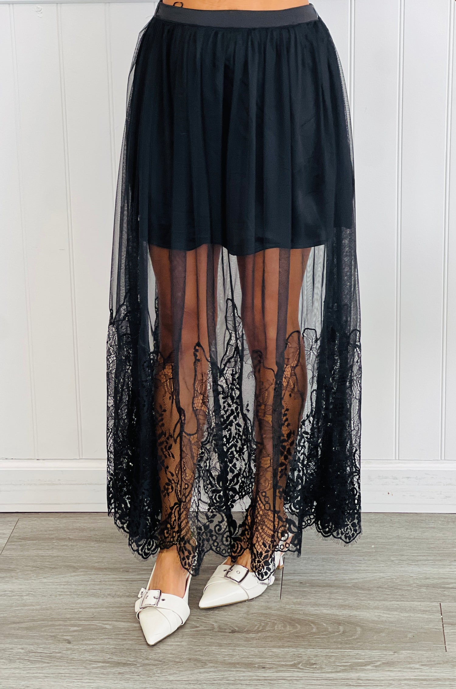 Black Sheer Mesh Lace Mini Lined Maxi Skirt (Reg.)