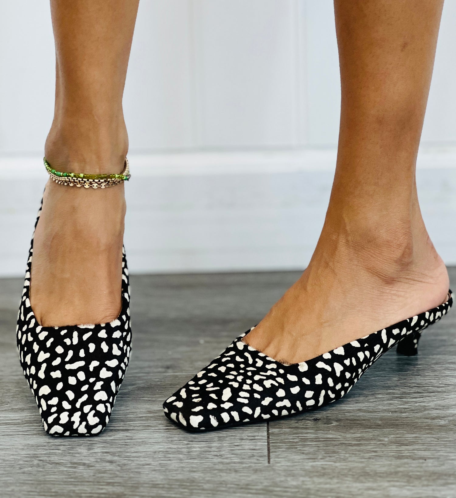 Add a bold pop to your formal wardrobe with the sleek Spotted Chic kitten heel. Featuring a striking black and white spotted calf hair upper, this square toe design is elevated by a kitten heel for just the right touch of drama and poise.