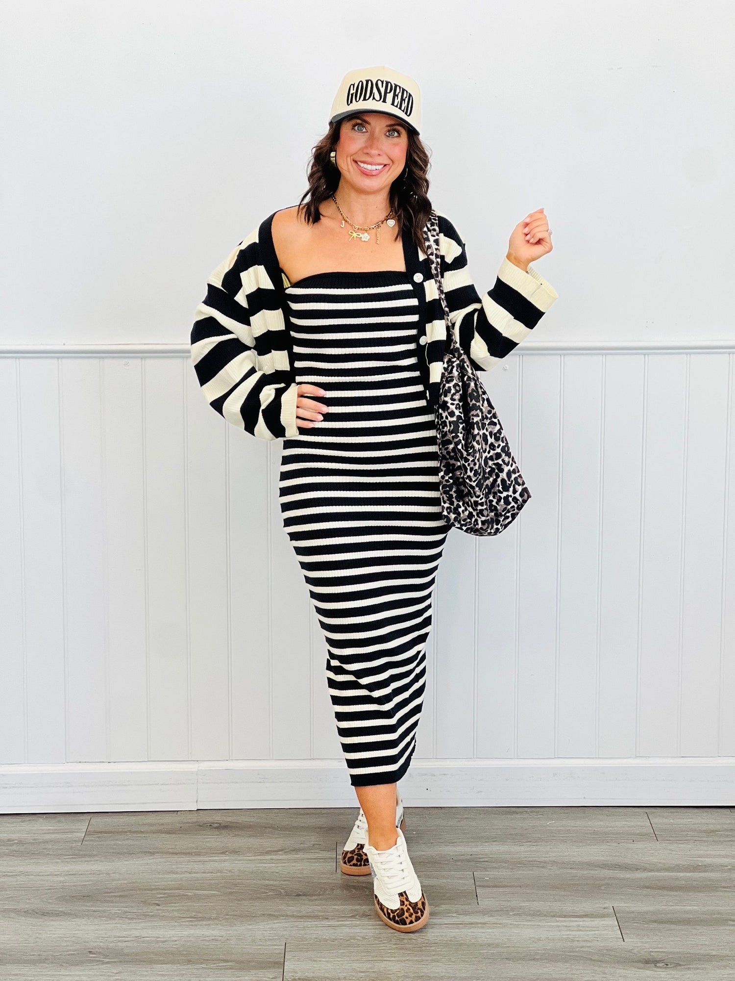 Black Striped Knit Cardigan & Midi Dress Set (Reg.)