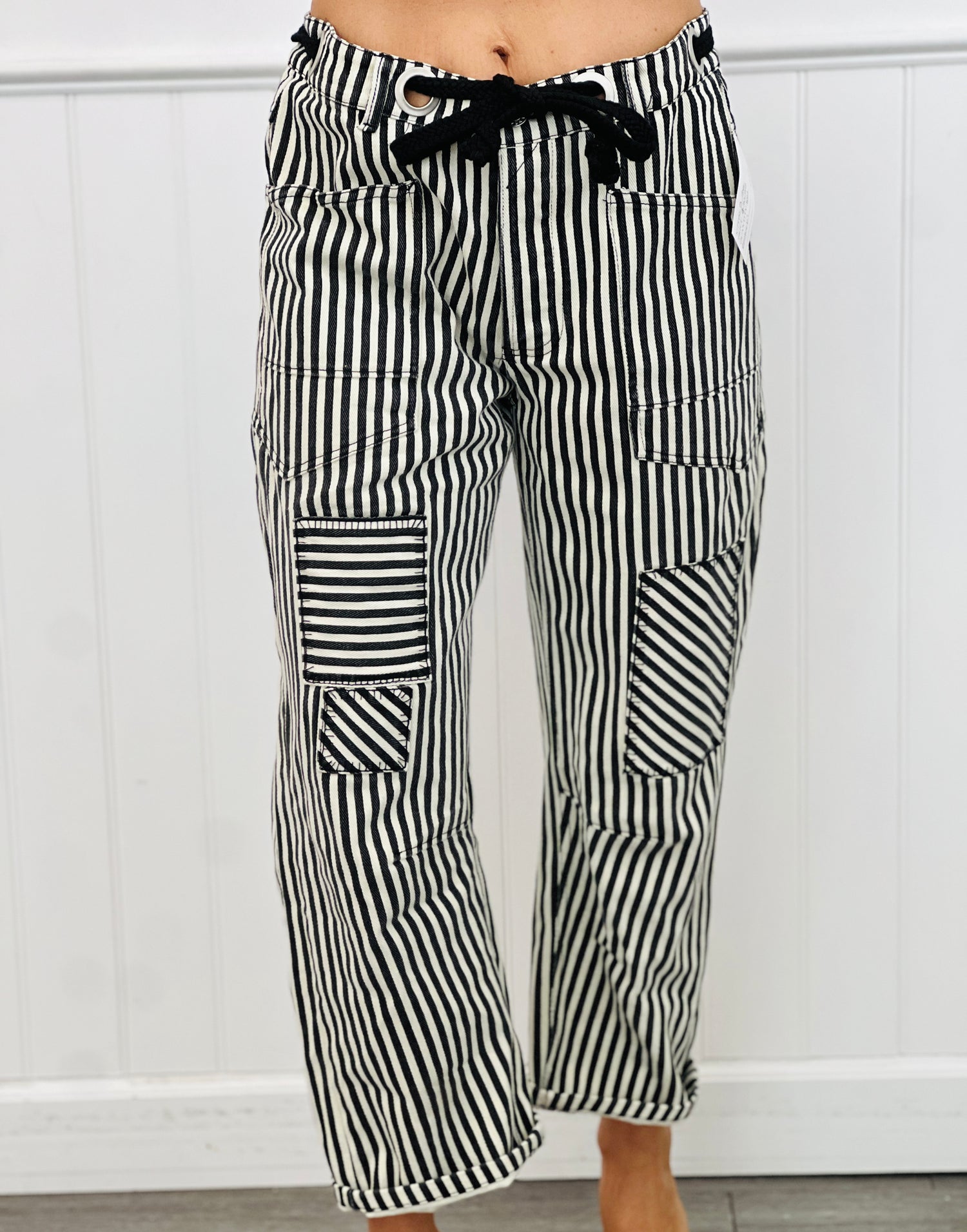 Introducing our on-trend Striped Twill Barrel Pants! These super cute pants feature barrel legs, front and back pocket, cargo pockets, button closure and a braided belt at waist that threads through grommets.