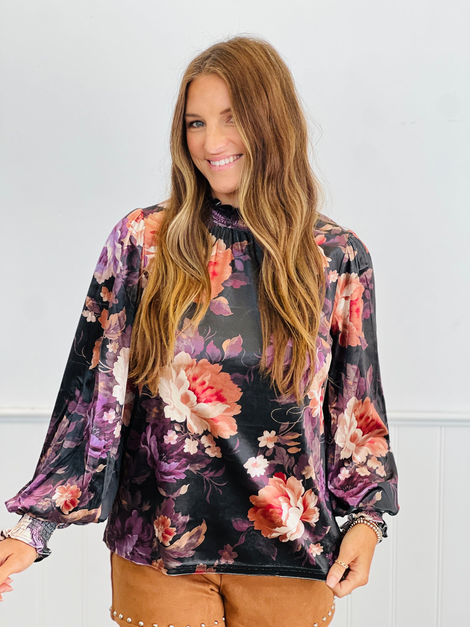 Our delightful Black Velvet Floral Frenzy Blouse will update your closet instantly. Features include a black multi floral print velvet fabrication, a smocked neckline, smocked cuffs and long full sleeves. Perfect for any occasion, this effortless pullover top will be a favorite.