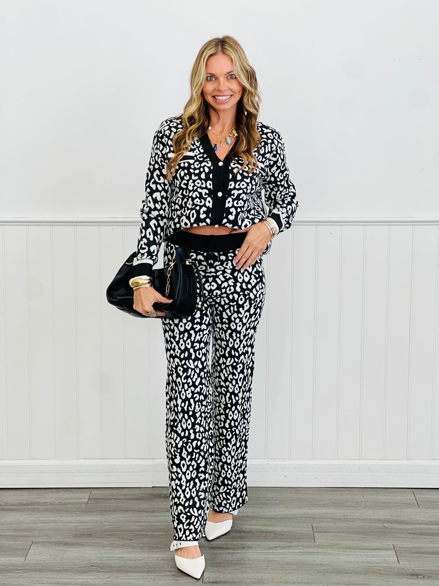 Embrace your wild side with this Black/White Leopard 2-piece set! Featuring a cozy cardigan with a button-up front perfect for layering and pants with an elastic waist plus drawstring for supreme comfort and adjustable fit. Whether lounging or stepping out, this playful set adds a fun, fierce touch to your everyday look.