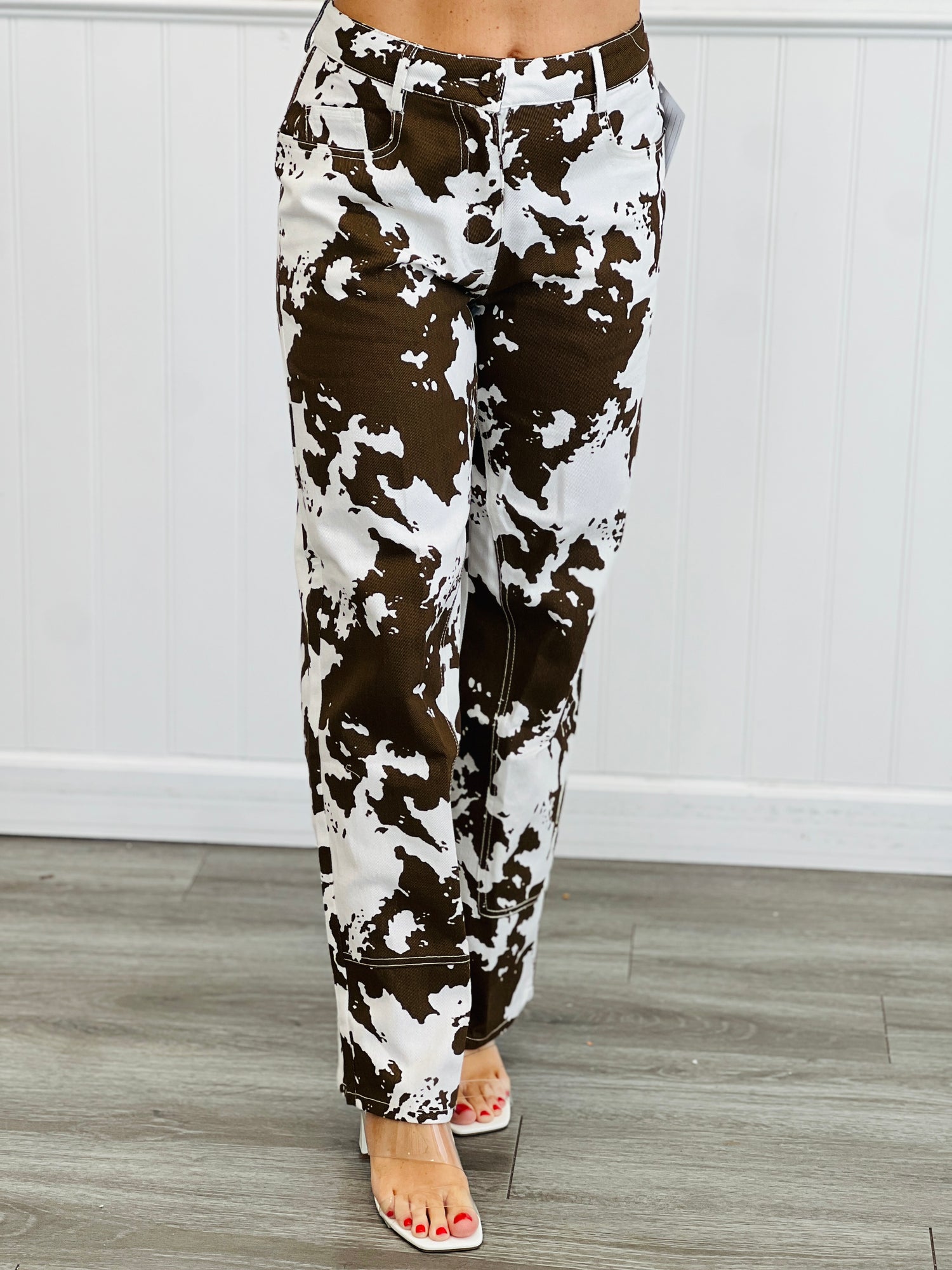 Introducing the Brown Cow Print Straight Leg Jeans. Features include a front button & zipper closure, pockets and straight legs. Perfect match to jacket CAR3150.