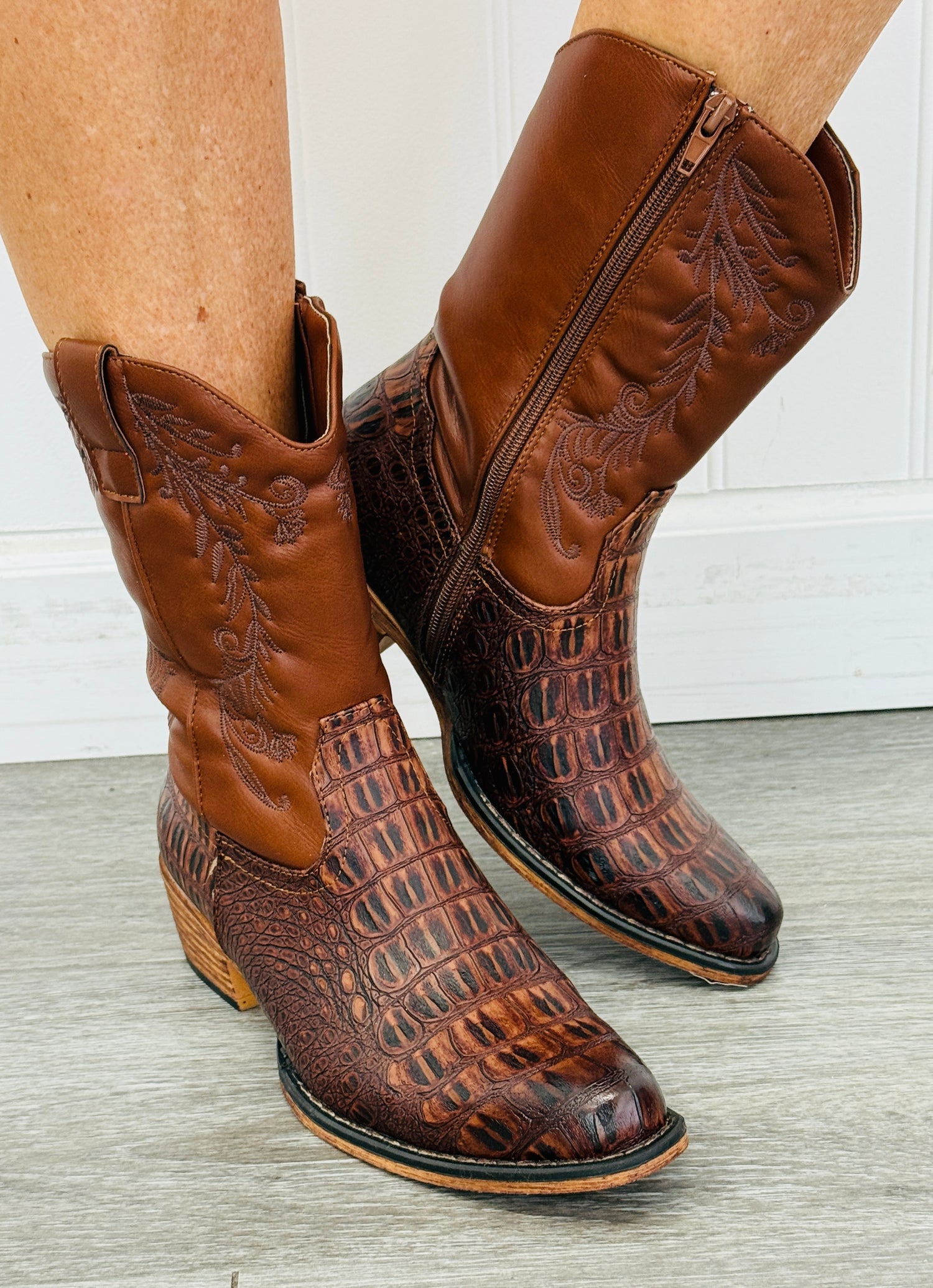 Step into style with these Brown Croc Rattler Rose Boots, featuring eye-catching embroidered detailing that adds a fun twist to classic western flair. Perfect for making a bold statement, these boots blend rugged charm with playful elegance, ready to liven up any outfit. Whether you're hitting the town or the trail, they bring a unique edge to your look.