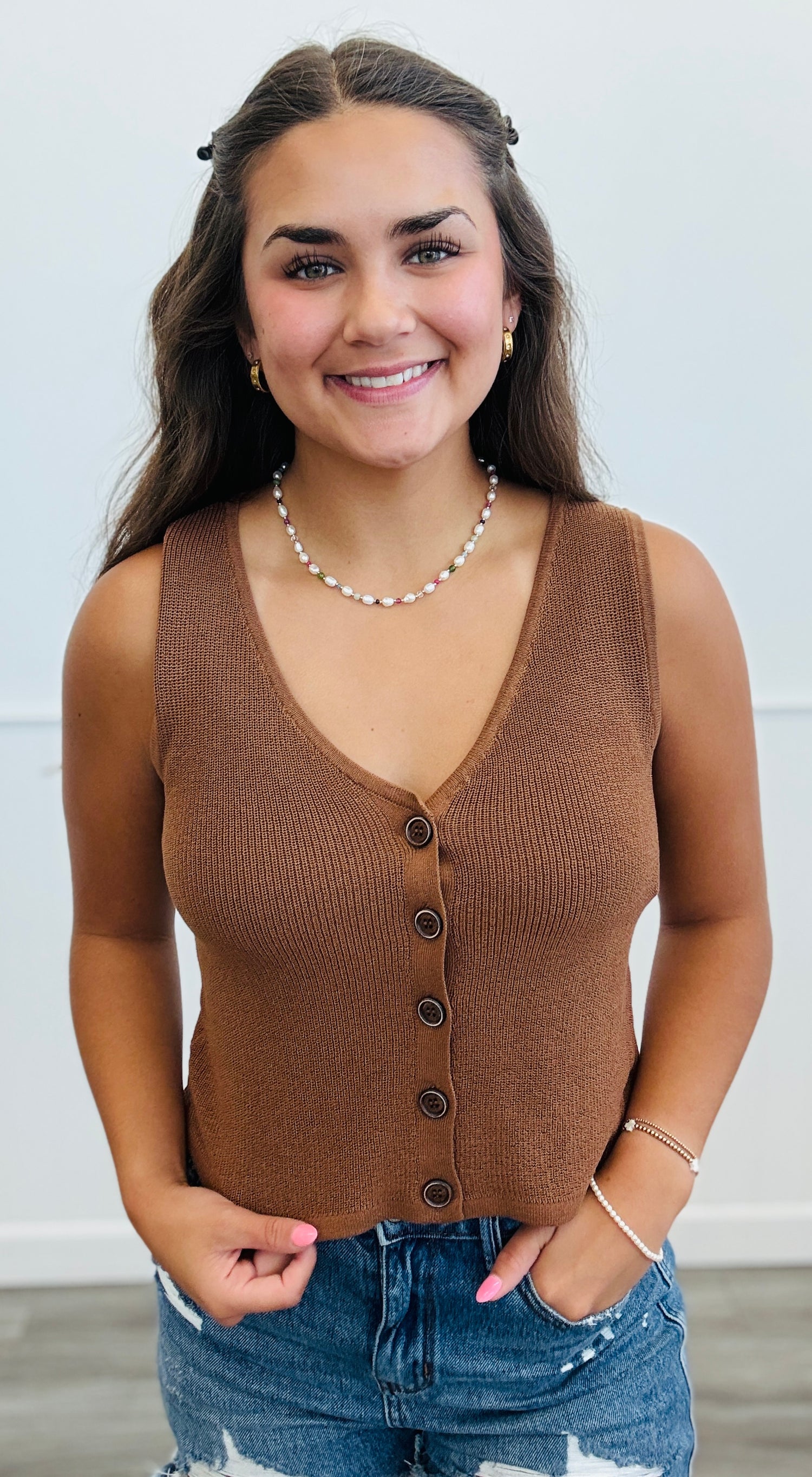 Introducing the versatile Brown Knit Cardi Vest Top. Features include a v-neckline, button-down front closure, contemporary waist length and unlined regular fit silhouette.