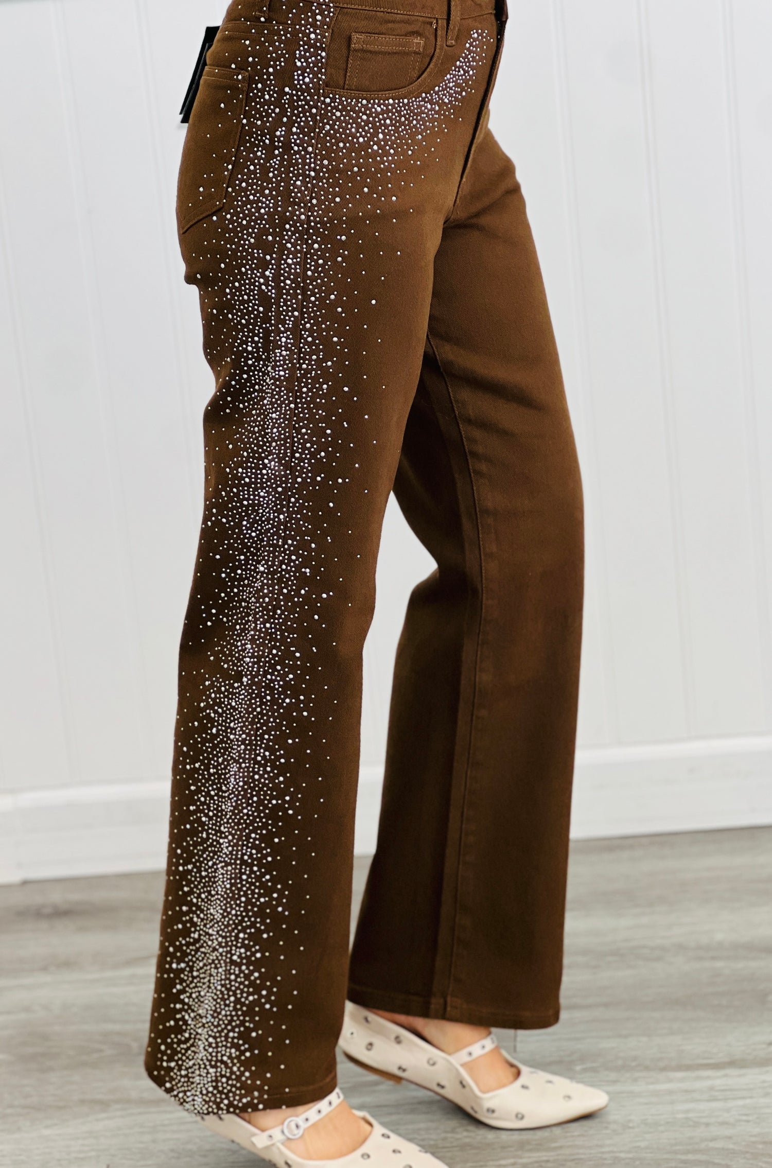 Step out in style with these Brown Rhinestone Embellished Straight Leg Pants. The sleek straight leg cut pairs perfectly with sparkling rhinestone details, adding just the right amount of sparkle to your everyday look. Comfortable and chic, they're ready to make any outfit pop with a playful twist.