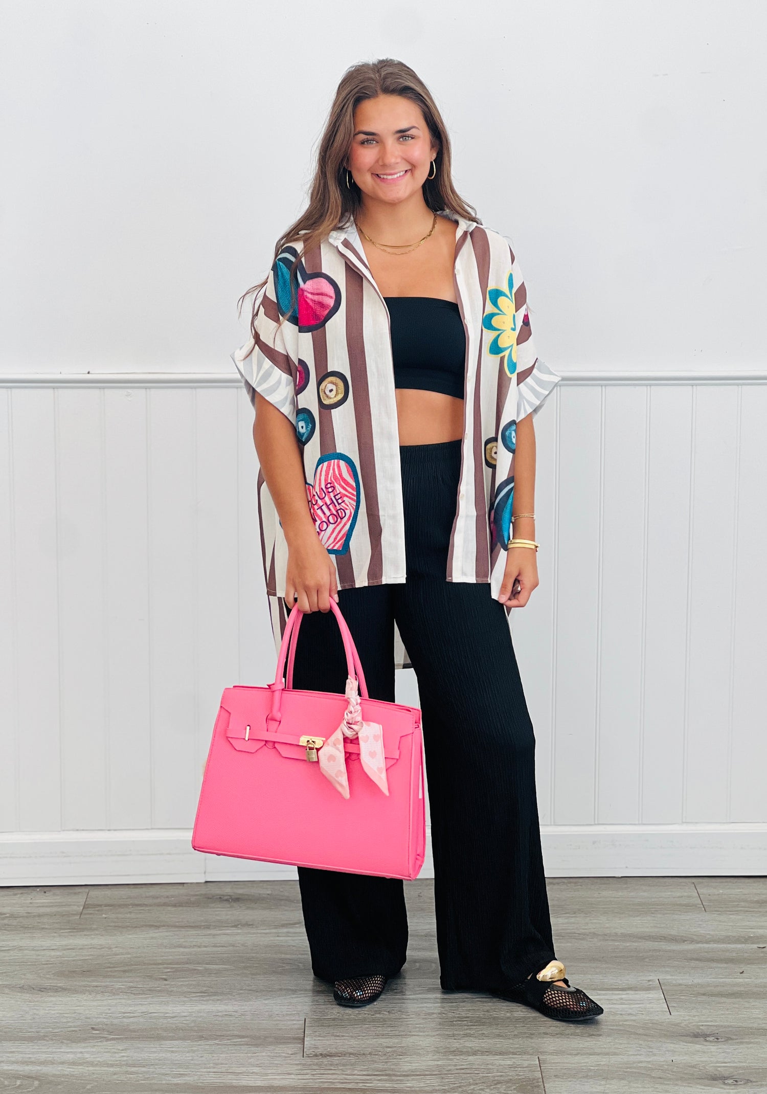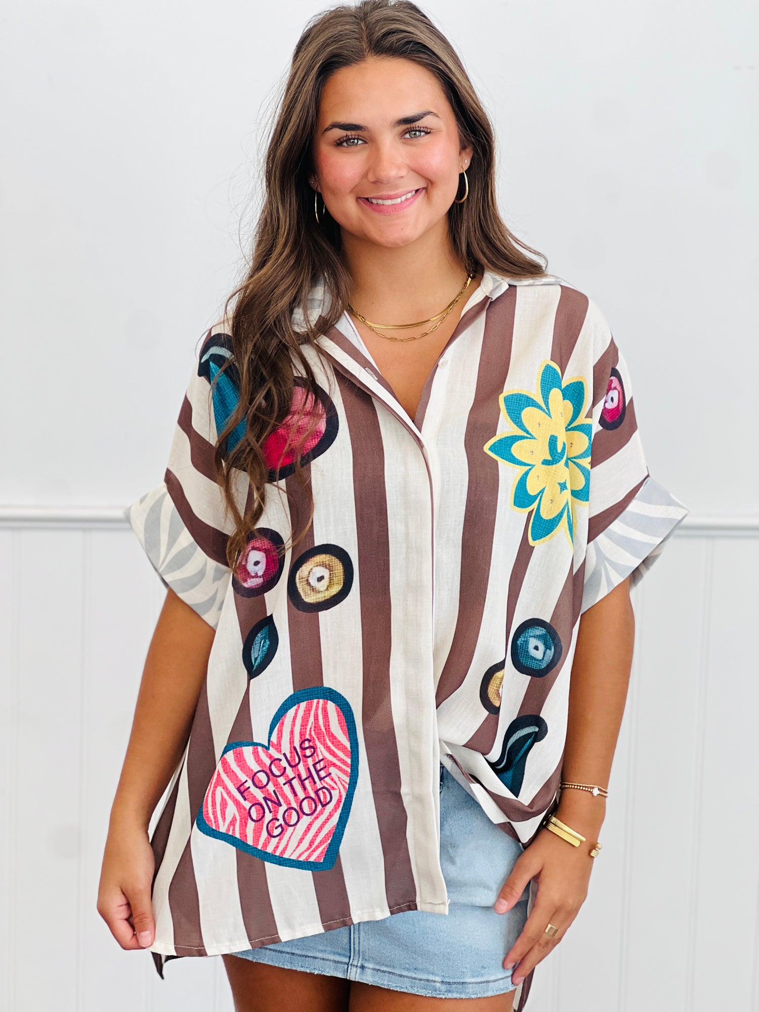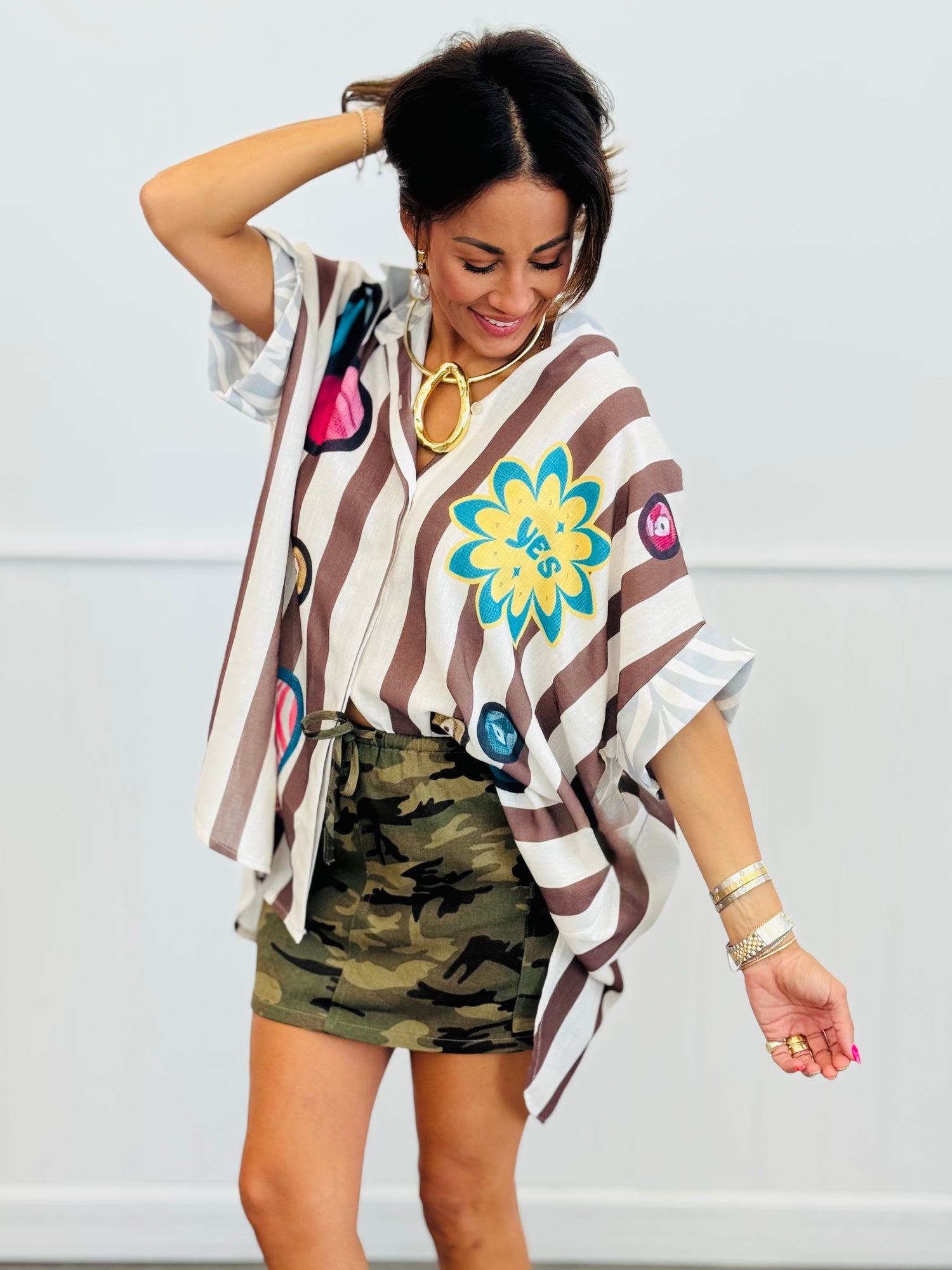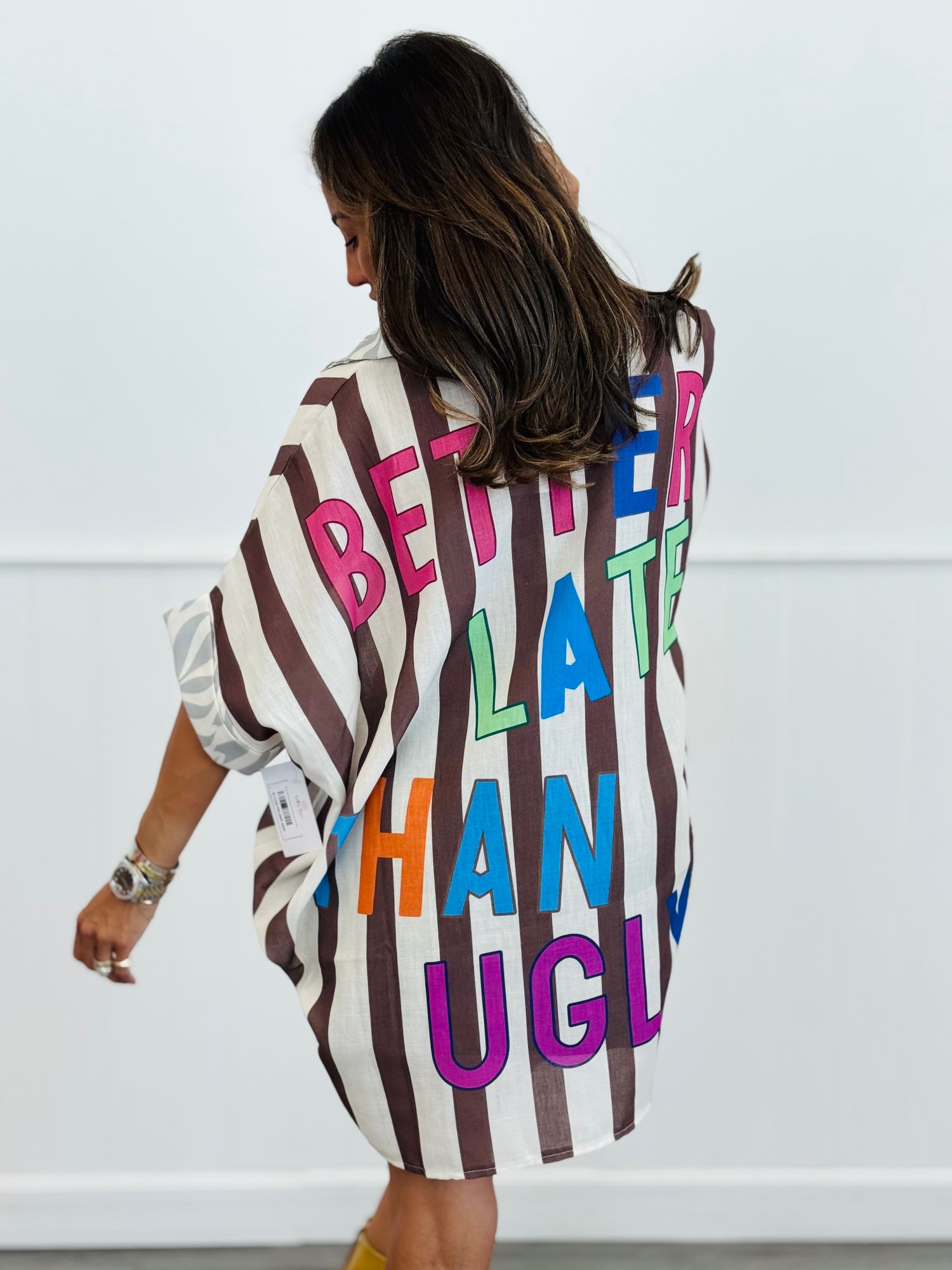 Add a dash of humor to your wardrobe with this Brown Stripe Better Late Than Ugly Top. Featuring a classic button-up design and playful stripes, it’s perfect for those who embrace fashionably late arrivals. The cheeky "Better Late Than Ugly" slogan on the back adds a fun twist, making this one-size top a standout piece for casual days or relaxed outings.