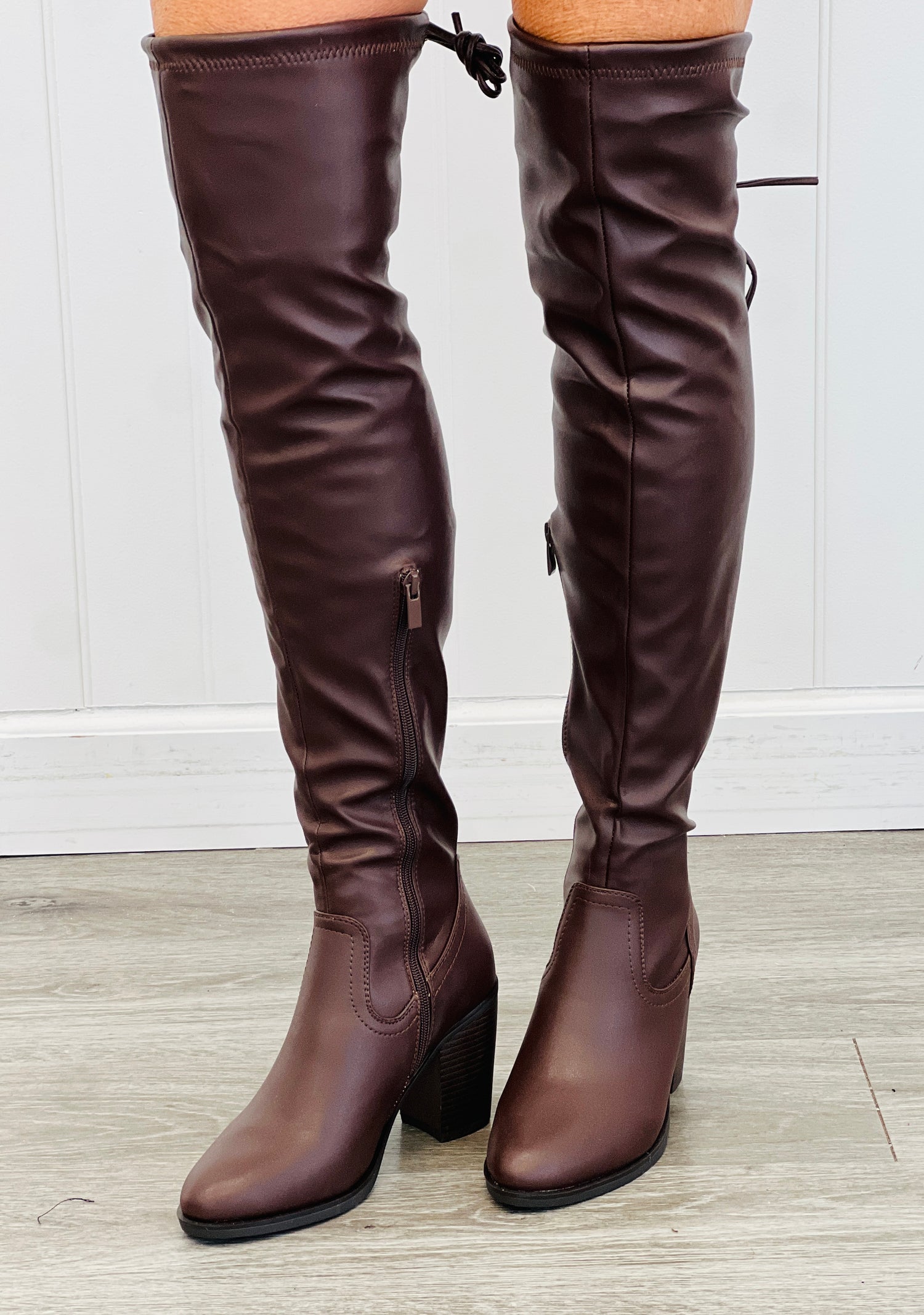 These Brown Take Action Over The Knee Boots are the ultimate showstopper! Made with faux leather, they feature a rounded toe, block heel and drawstring detailing - so you can strut your stuff with style and ease. Get ready to be the talk of the town.