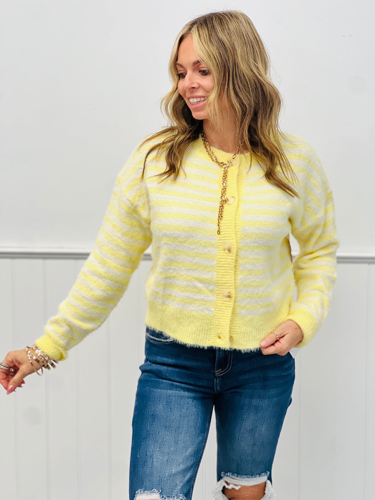 Wrap yourself in cozy charm with this butter yellow striped button-down cardigan. Crafted from soft, fuzzy fabric, it's the perfect layer for effortless style. The classic stripe pattern adds visual interest while the relaxed fit keeps things comfortable all day long. Whether you're heading to brunch or settling in for a casual weekend, this cardigan brings warmth and whimsy to any outfit.