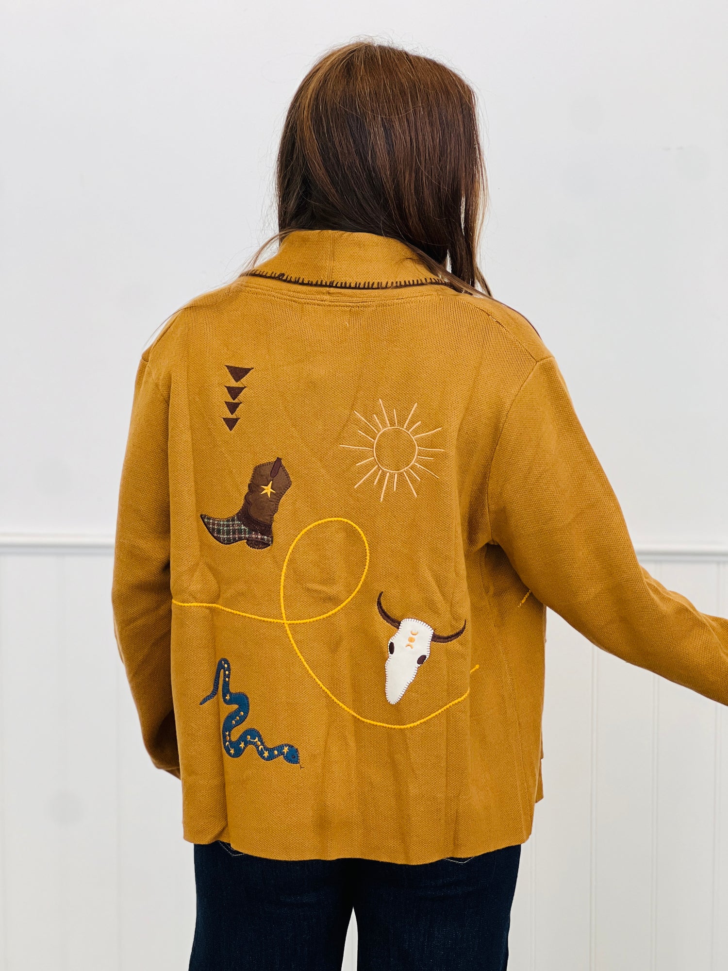 Wrap yourself in cozy charm with this Camel Shawl Collar Western Embroidery Cardigan. Featuring a soft texture and a playful western print, its fitted silhouette and long sleeves make it perfect for layering. The V-neck and button-down front add a touch of classic western flair, while the embroidery brings delightful detail to every look. Perfect for adding a little rodeo-ready style to your everyday wardrobe!