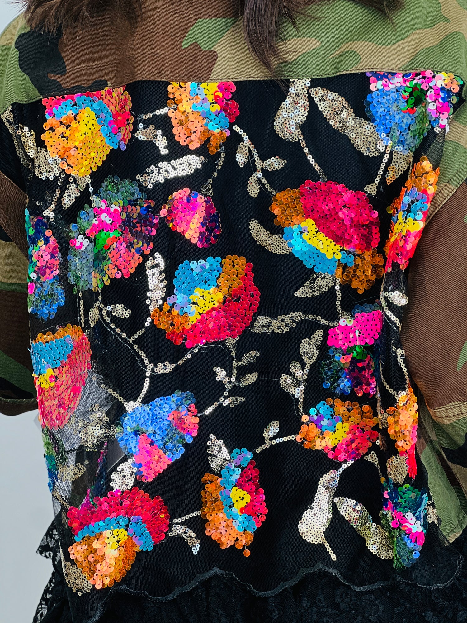 Introducing our on-trend contemporary Camo Print Contrast Sequin Jacket. Featuring long sleeves, a chest pocket, front button down closure, and waist length silhouette, this jacket is both fierce and fun.