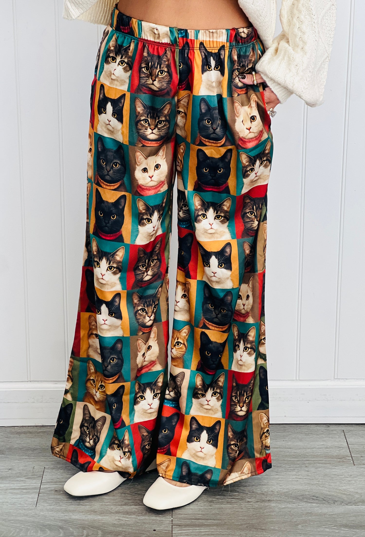 Step into the spotlight with our Cat Portrait Wide Leg Pants, designed for comfort and style. These full-length pants feature a wide, flowy leg that moves with you, an easy elastic waistband, and handy pockets for your essentials. The fun multi colored print with a variety of cats adds a playful twist.