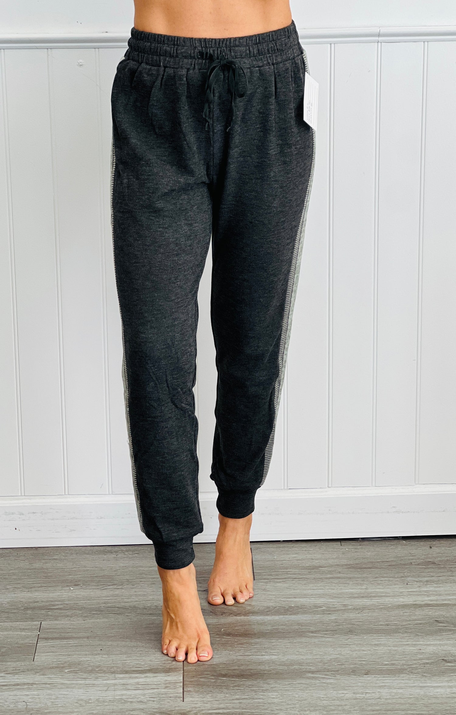 Get comfy and look great wearing the Charcoal Color Blocked Jogger Pants. These fun and functional pants feature an elastic waist with drawstring tie, ribbed cuffs, contrast side stripe and regular fit silhouette. Perfect match to sweatshirt TOP11899.