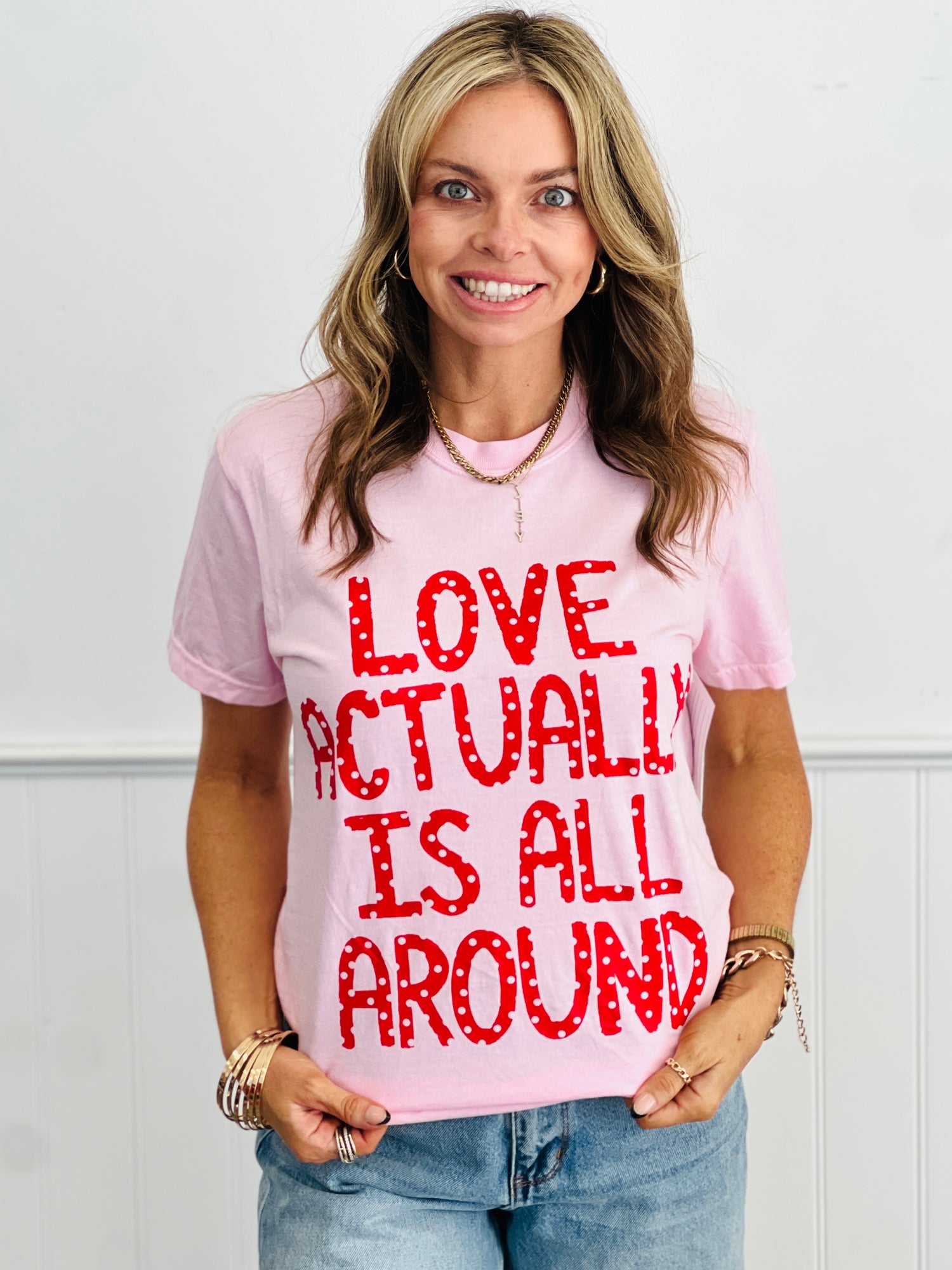 Celebrate the magic of the season with this charming graphic tee featuring the iconic "Love Actually Is All Around" message on a soft pink background. Perfect for holiday gatherings, cozy nights in, or spreading festive cheer, this short-sleeve tee combines comfort with nostalgic charm. Whether you're a devoted fan of the beloved film or simply love spreading warmth and joy, this playful piece is your go-to for effortless style.