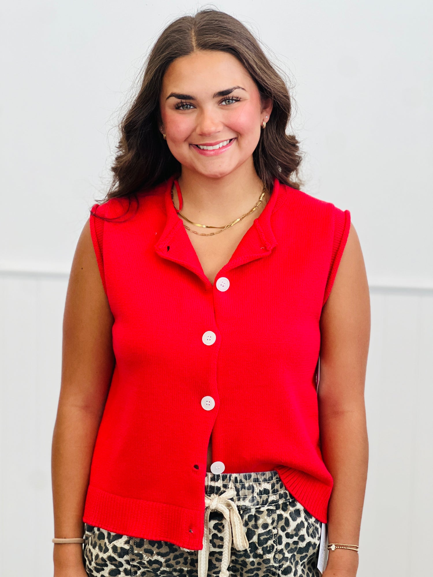 Introducing the Cherry Rolled Edge Sleeveless Sweater. Features include a relaxed fit and front button-down closure. Whether worn open as a vest or buttoned up as a top, this piece effortlessly combines comfort and style.