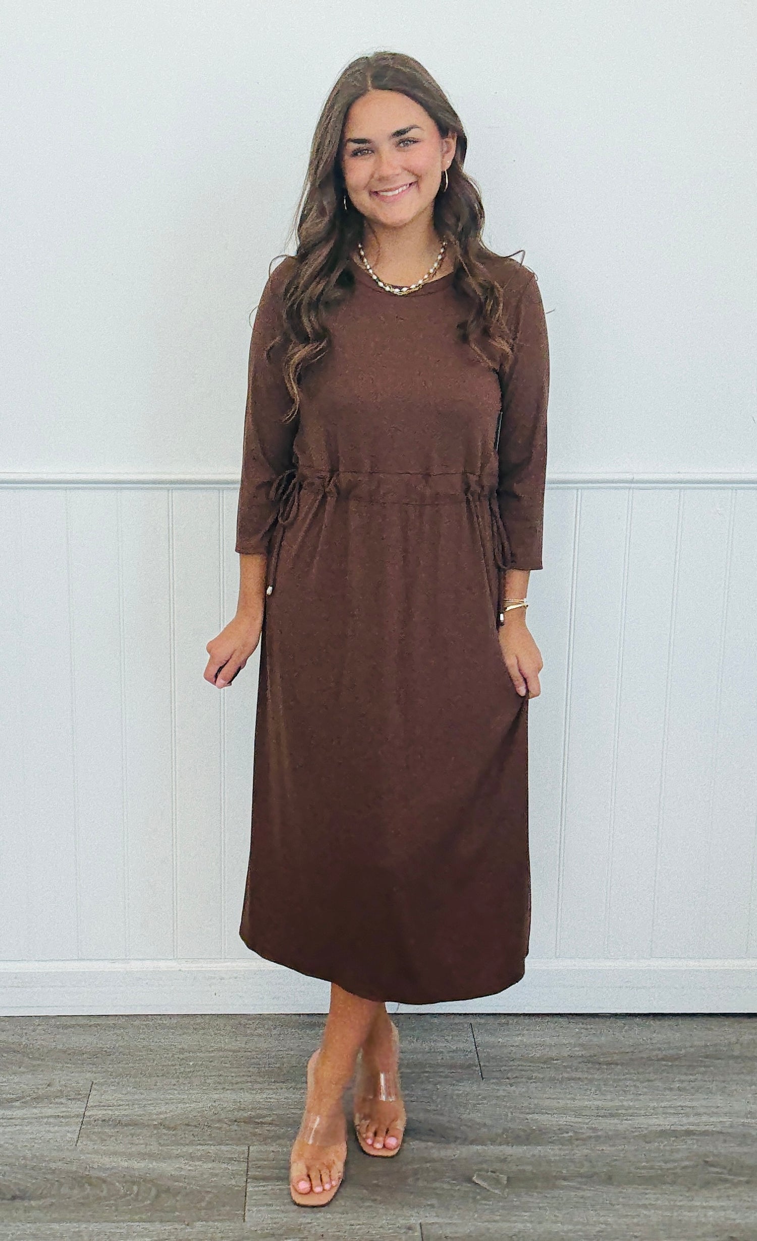 Add a boost to your casual closet with the super cute Chocolate Carefree Midi Dress. Features include a round neckline, 3/4 sleeves, side slant pockets, drawstring waist detail at sides and relaxed silhouette.