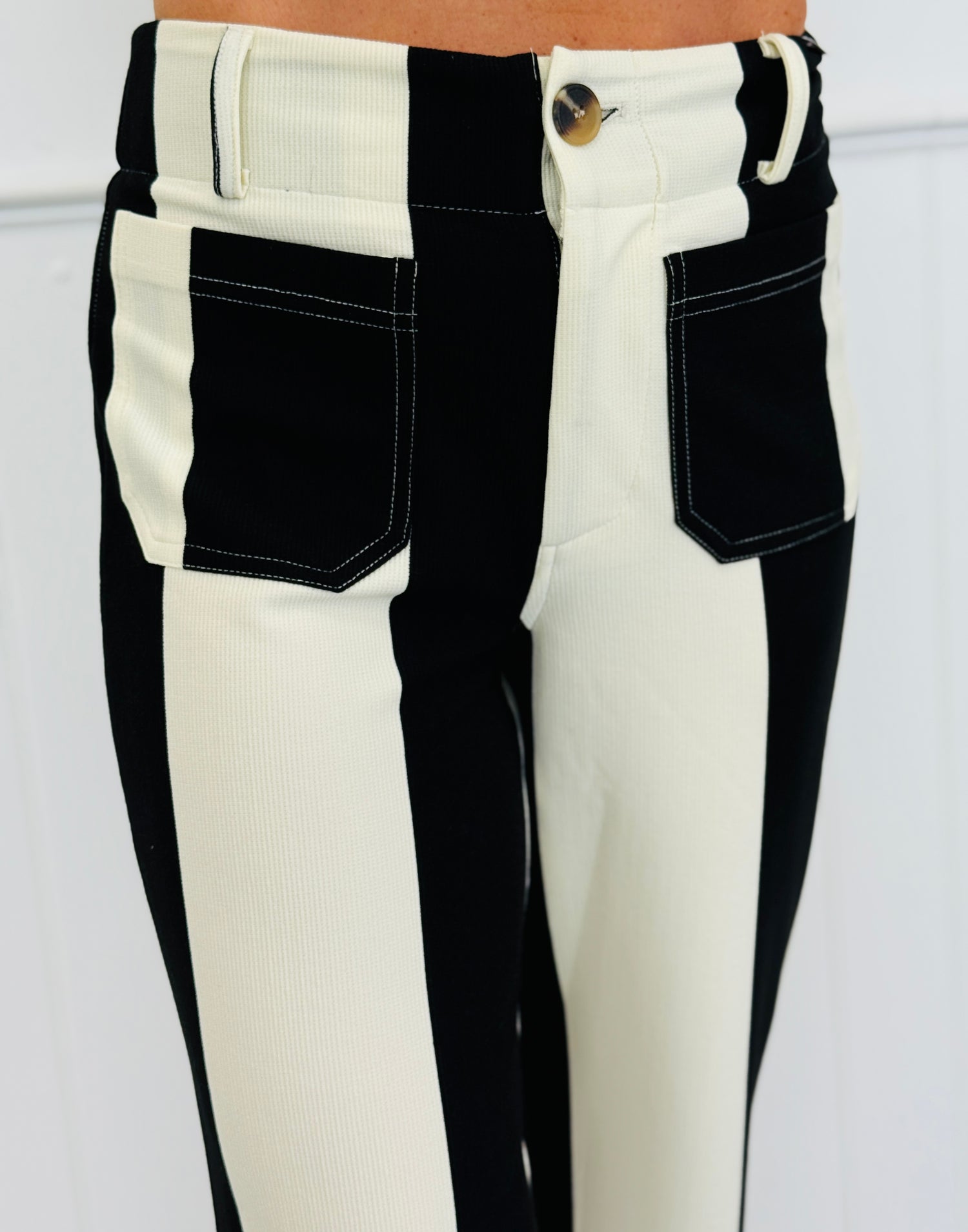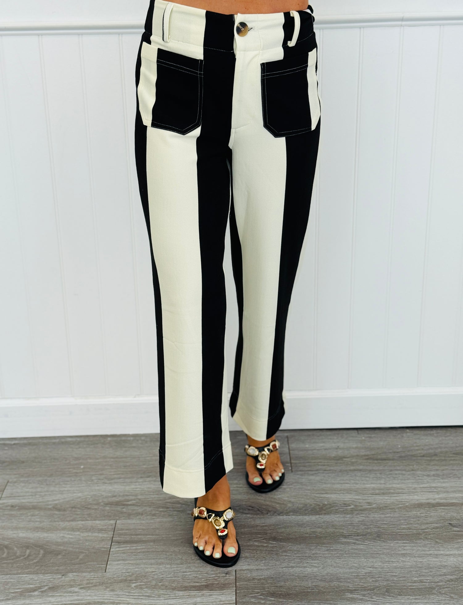 Refresh your closet with the bold and beautiful Colette Crop Wide Leg Pants! These super cute pants feature a front button & zipper closure, wide cropped legs and patch pockets. The wide bold stripe pattern is sure to turn heads and receive admiring glances!