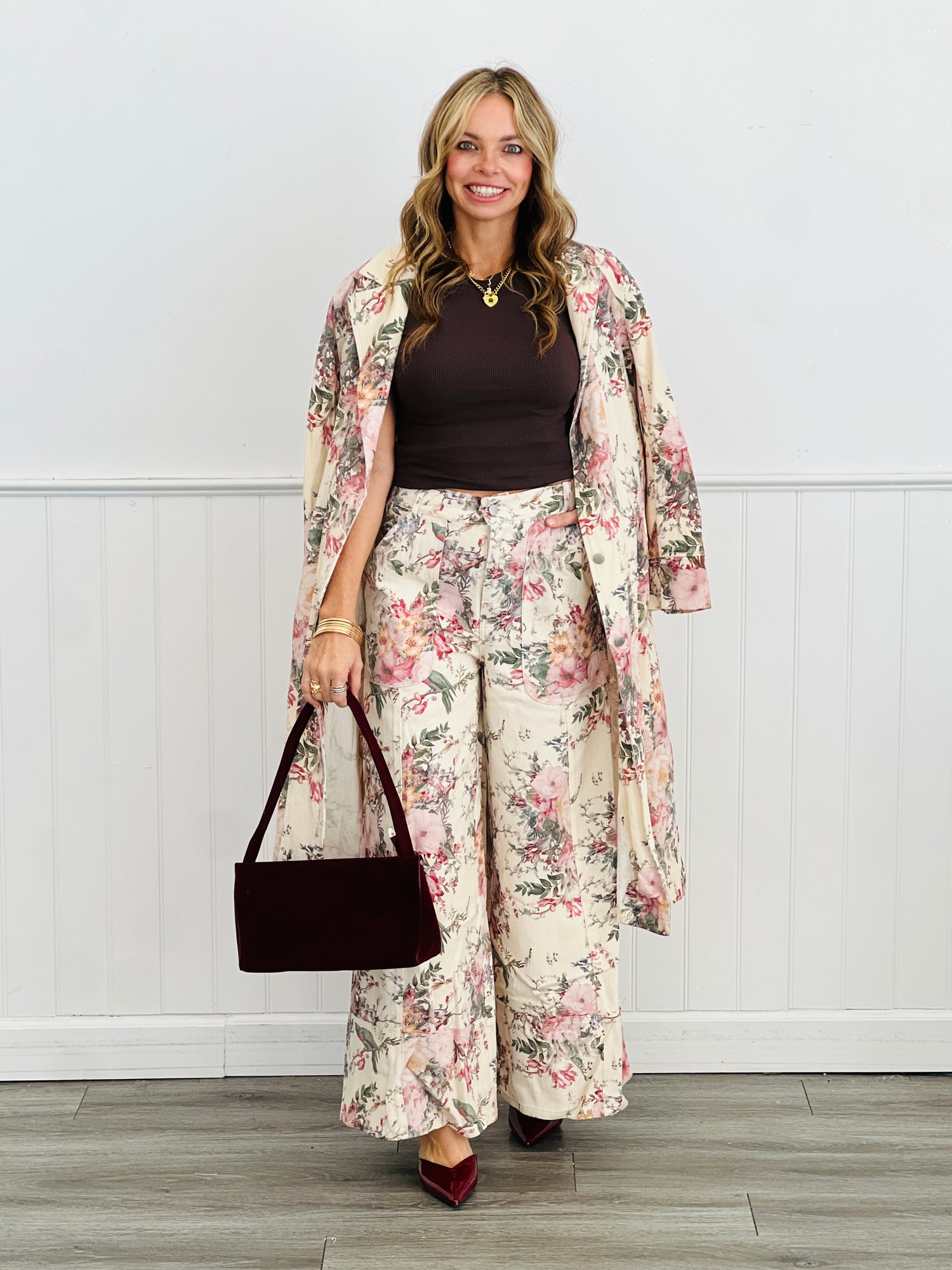 Stay warm and stylish with our fabulous Cream Floral Duster Jacket! Features include long sleeves, lapel collar and front button-down relaxed silhouette. Midi length coat falls below the knees.