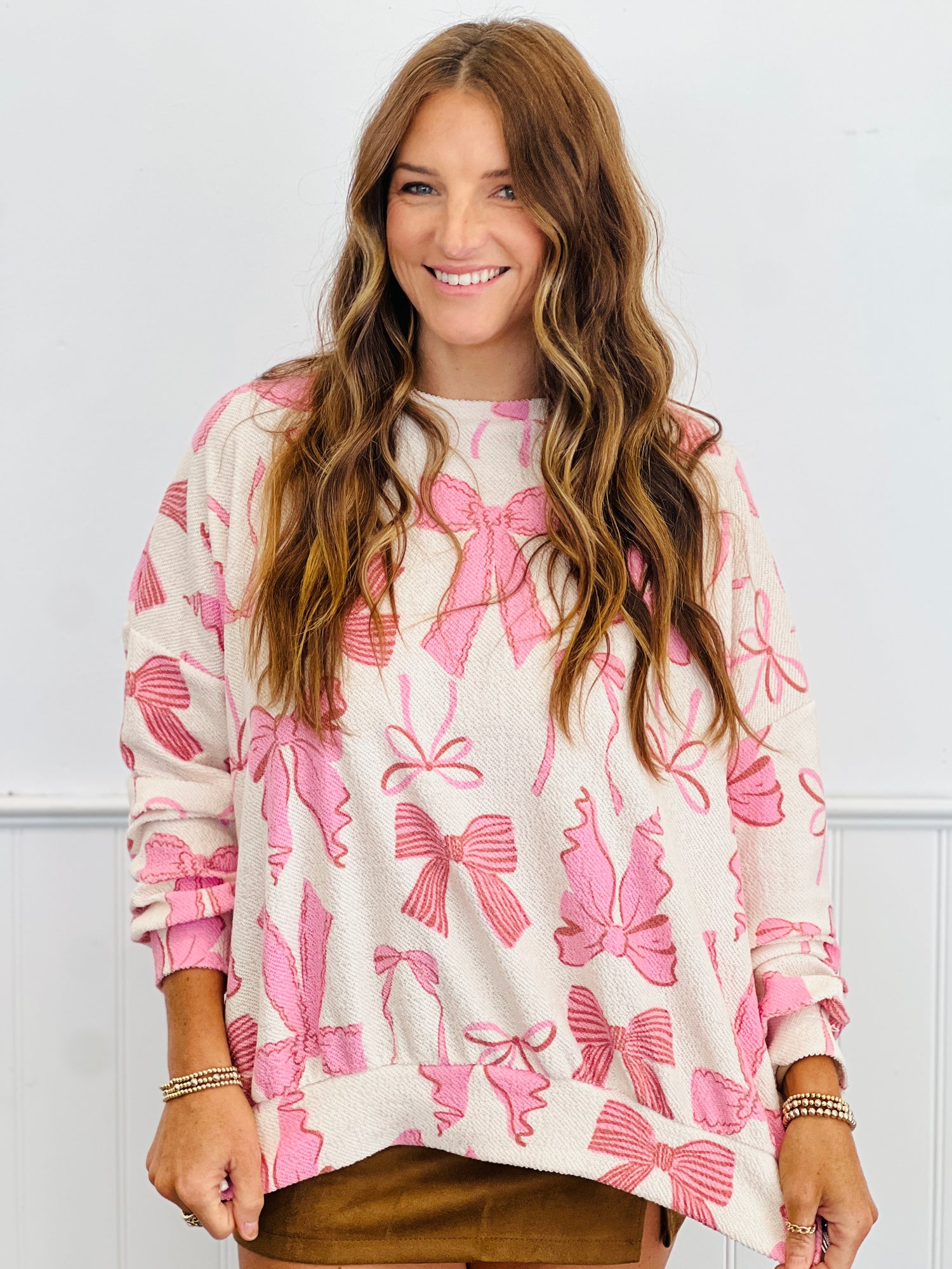 Introducing the super cute Cream/Pink Bow Tied Print Top. Features include long sleeves, banded cuffs, round banded neckline, banded hemline and bow print pattern.