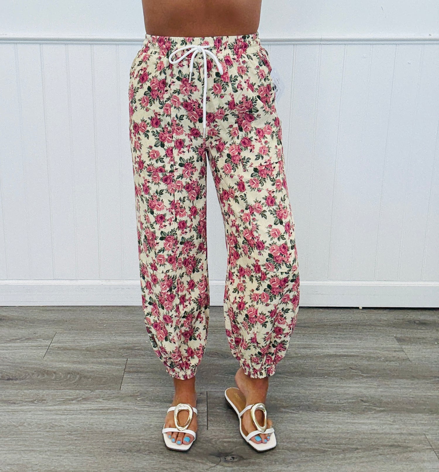 Introducing our super cute on-trend Cream/Pink Floral Print Twill Joggers! These poly/nylon twill floral print pants feature an elastic waist, side pockets, elastic cuffs and a drawstring belt.
