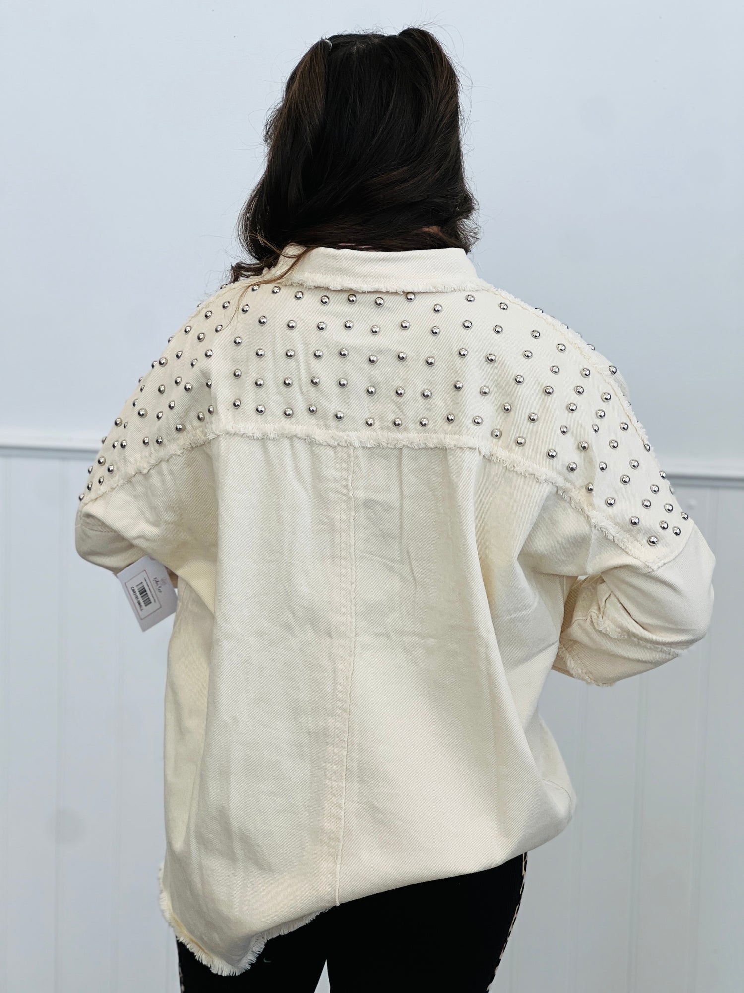 Introducing our fabulous oversized Cream Studded Splendor Shacket. This versatile beauty features an inset collar, front snap-down closure, long frayed sleeves, flap chest pockets, studded yoke back, back center seam and raw high-low hem.