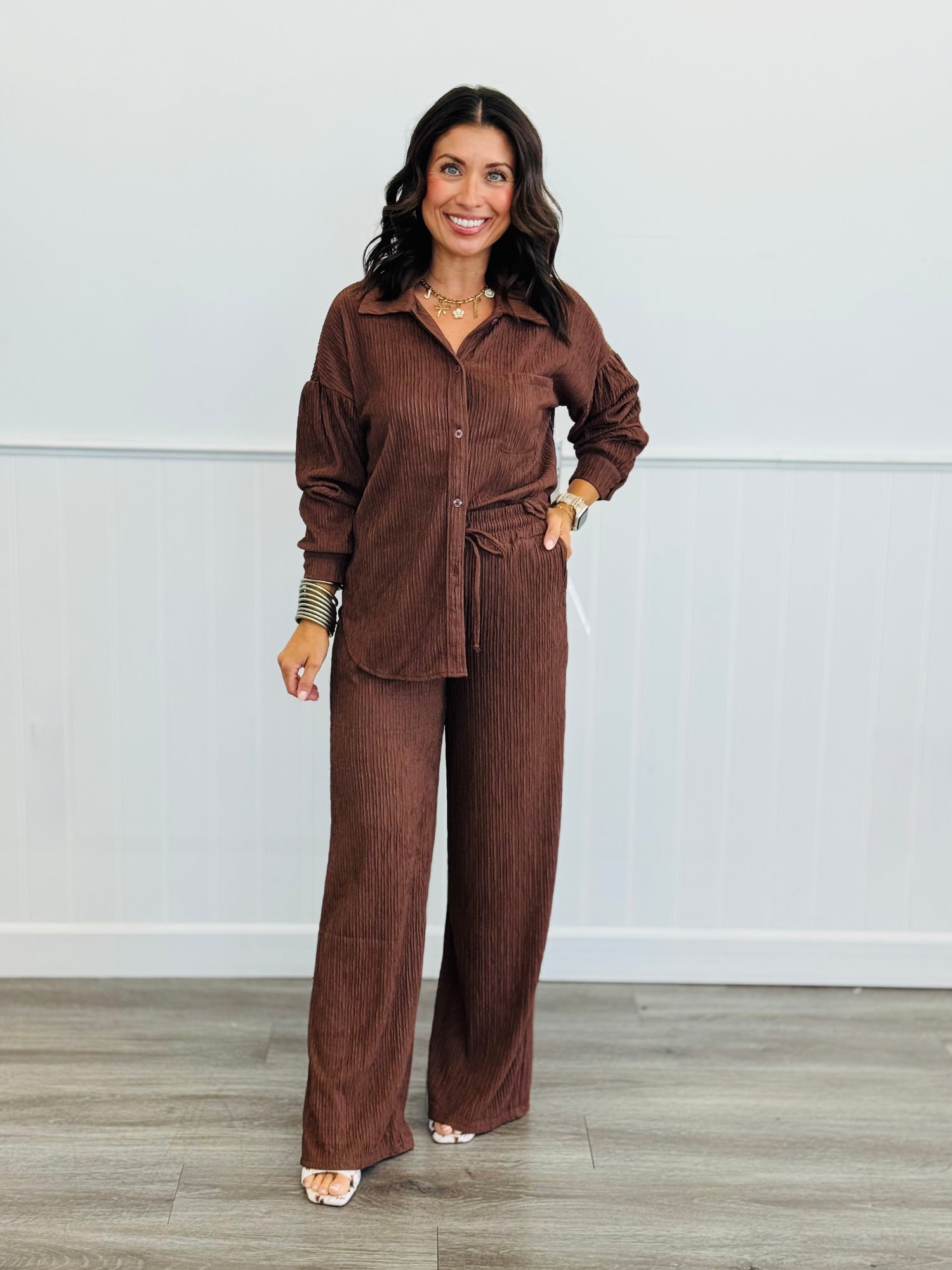 Introducing the chic yet comfy Crinkled Plisse Shirt & Pants Set! This ensemble invites you to indulge in the luxurious feel of finely pleated plisse fabric, designed to capture the essence of sophisticated leisure. The button-down long sleeved shirt drapes beautifully over the frame, complementing the graceful flow of the wide-leg pants that have an elastic waist and side slant pockets. This set promises a look that's as captivating as it is comfortable.