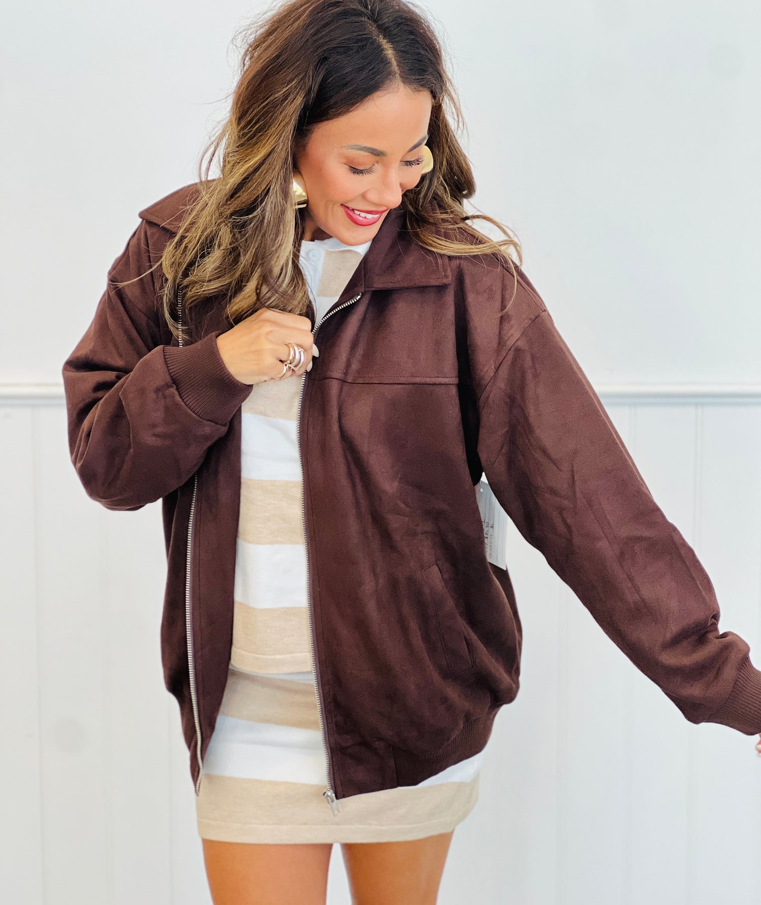 Introducing the oversized Dark Brown Suede Bomber Jacket. Features include a front zipper closure, dropped shoulders, collar, side slant pockets and ribbed cuffs. Suede fabrication.