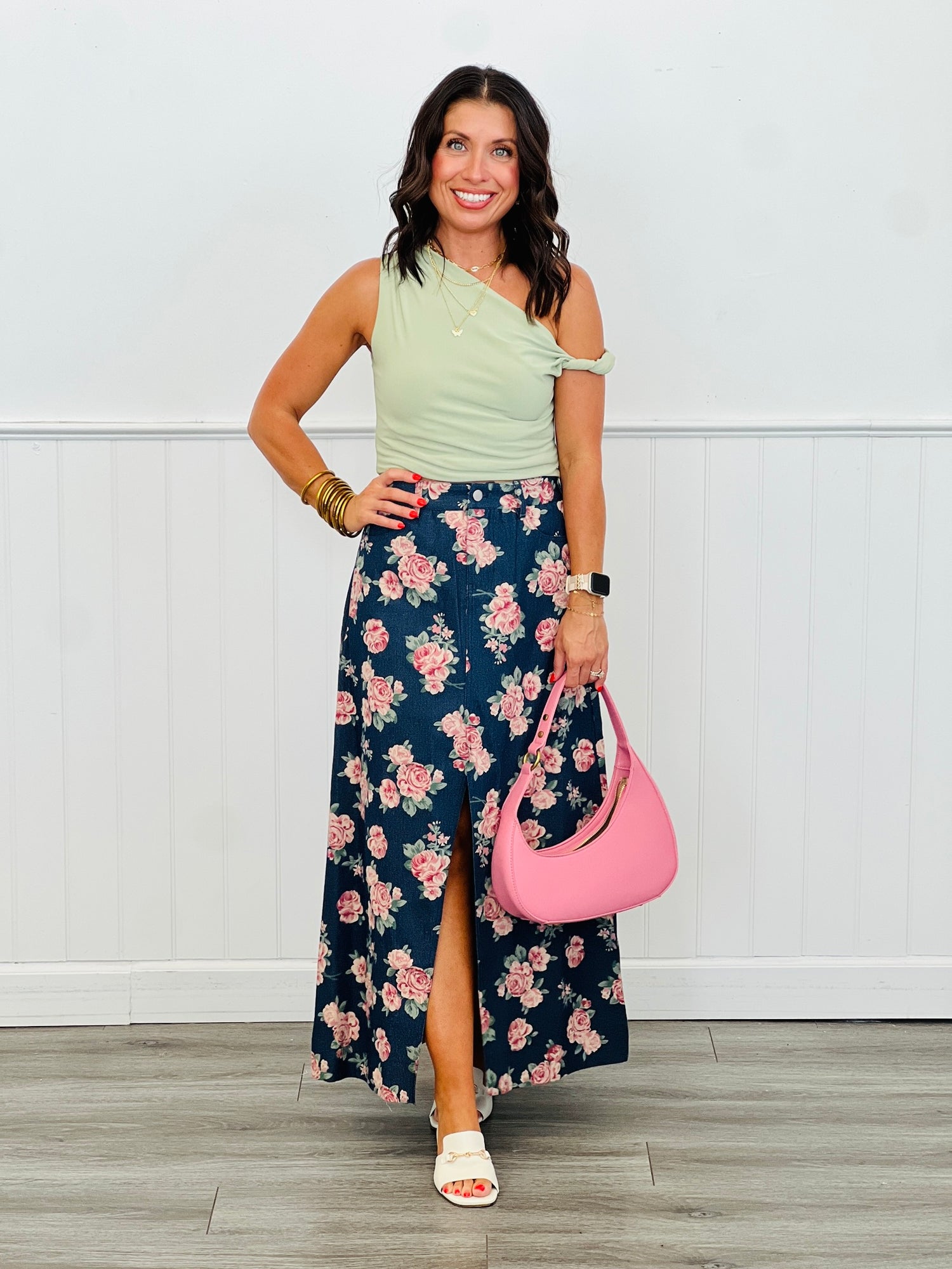 Dark Denim Floral Print Front Slit Midi Skirt (Reg. and Plus)