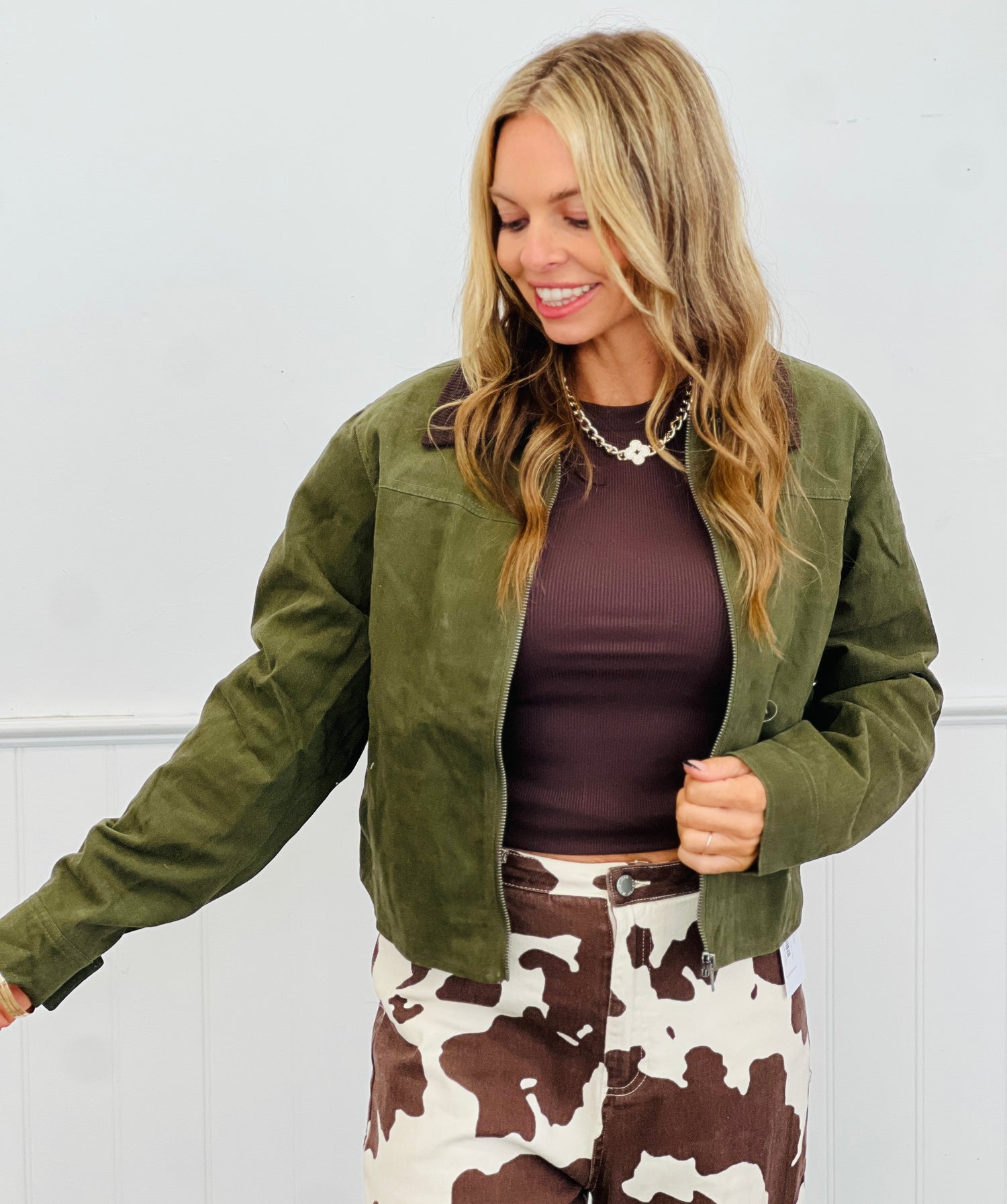 Dark Olive Contrast Corduroy Collar Zip Up Jacket (Reg.)