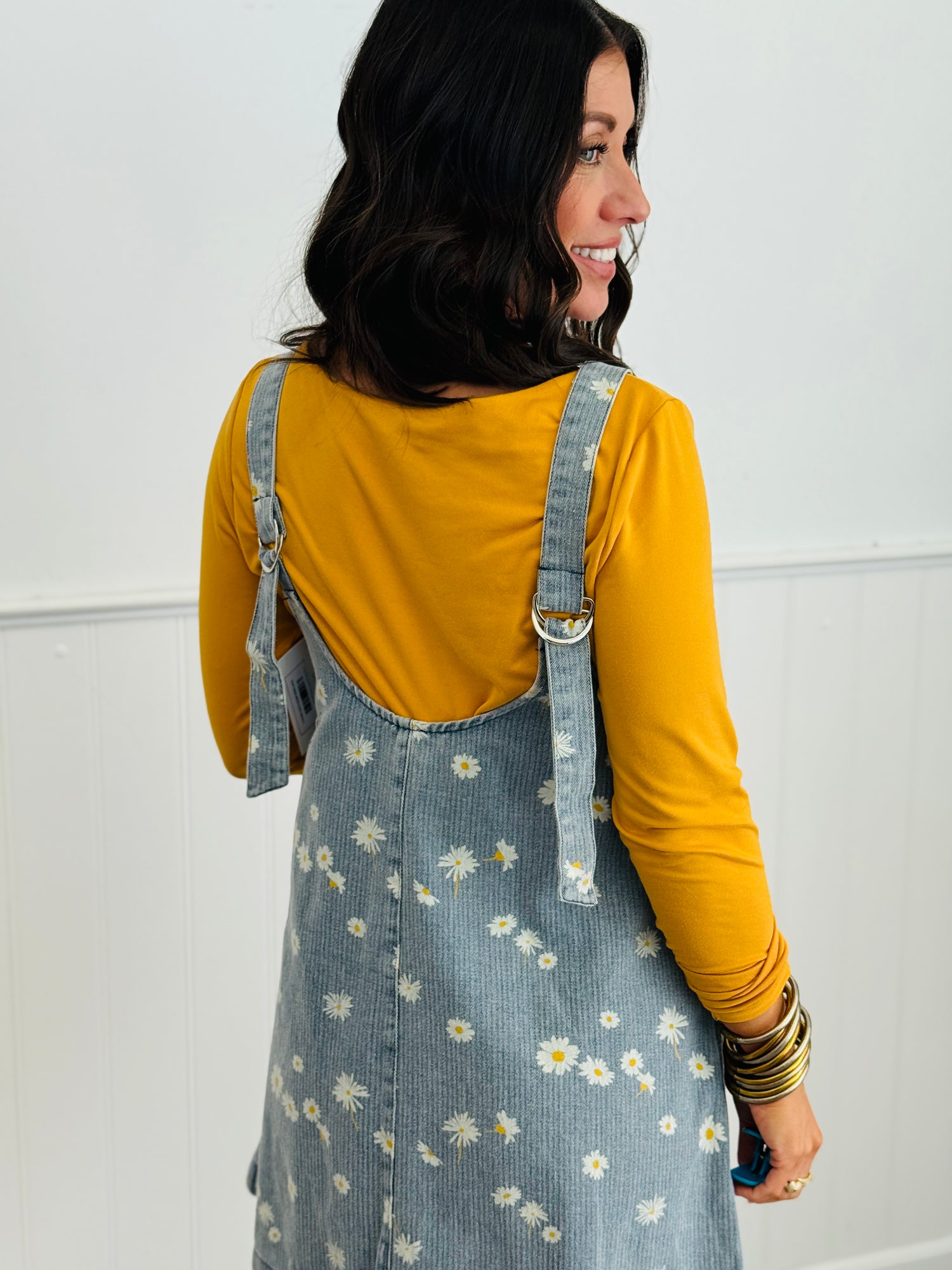 Sunshine meets style in this charming denim mini dress, featuring an all-over daisy print that brings instant joy to your everyday rotation. The relaxed fit, plunging V-neckline, and roomy patch pockets deliver effortless comfort and practicality. Layer it over a fitted tee for a casual vibe, or wear it solo for those warm-weather days. A breezy, feel-good piece that's as fun to wear as it is to look at.