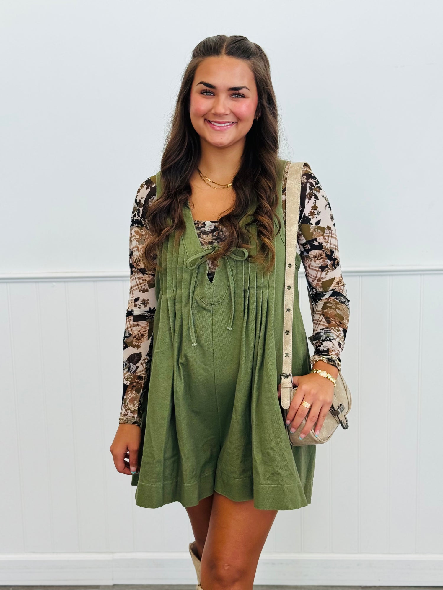 This denim romper features pintuck detailing and a tie-front neckline, adding texture and charm to its casual design. Its relaxed fit and sleeveless style provide all-day comfort, perfect for layering over a tank or tee. With a playful silhouette and timeless denim appeal, it's ideal for effortless, everyday wear.