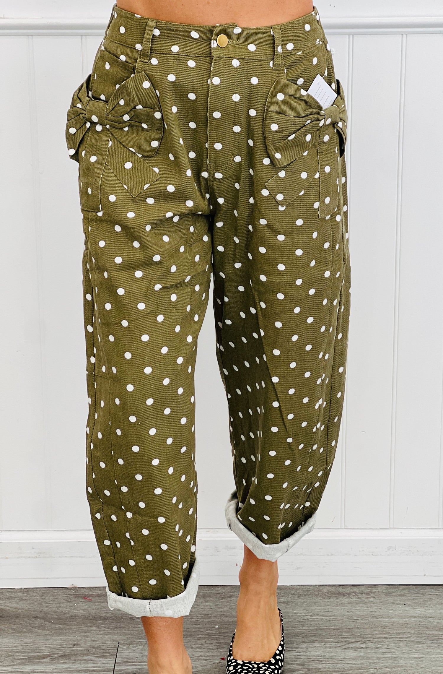 Add a fun twist to your wardrobe with these high-rise denim pants adorned with playful polka dots. Featuring bow-tied side panels and a relaxed tapered leg, they offer a flattering fit and a unique style that’s perfect for making a cheerful statement. Available in regular and plus sizes across three vibrant colors, these pants bring both comfort and personality to your everyday look.