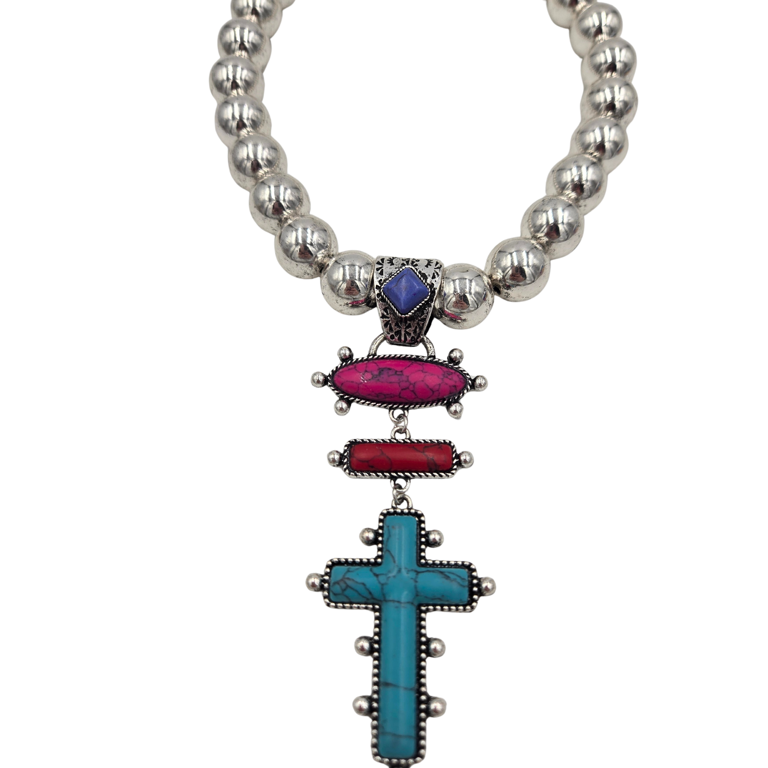 Make a bold statement with this eye-catching Desert Cross Beaded Necklace! Chunky silver beads create a striking foundation for vibrant red and pink stone pendants that pop with personality, while a gorgeous turquoise cross adds southwestern charm. Perfect for layering or wearing solo, this playful piece brings color and character to any outfit. Whether you're channeling boho vibes or adding a touch of desert-inspired flair to your everyday look, this necklace is sure to turn heads and spark conversations.
