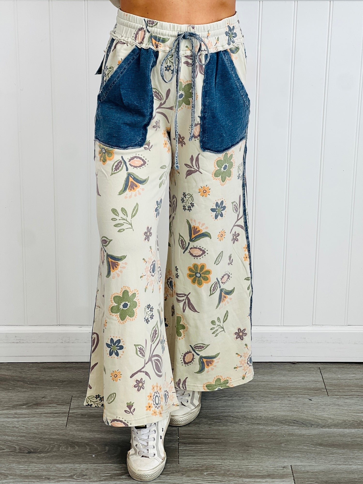 Introducing the Ecru Mineral Washed Floral Print Pants. Features include an elastic waistband with drawstring tie, contrast patch pockets, wide legs and floral print pattern. Perfect match to shirt TOP11723.